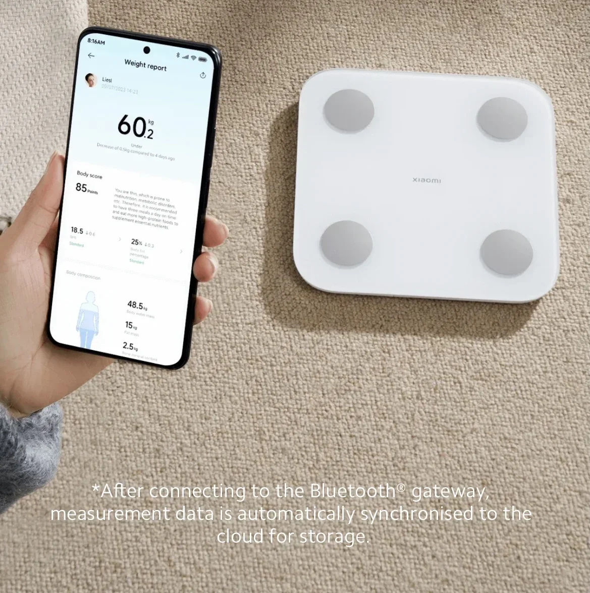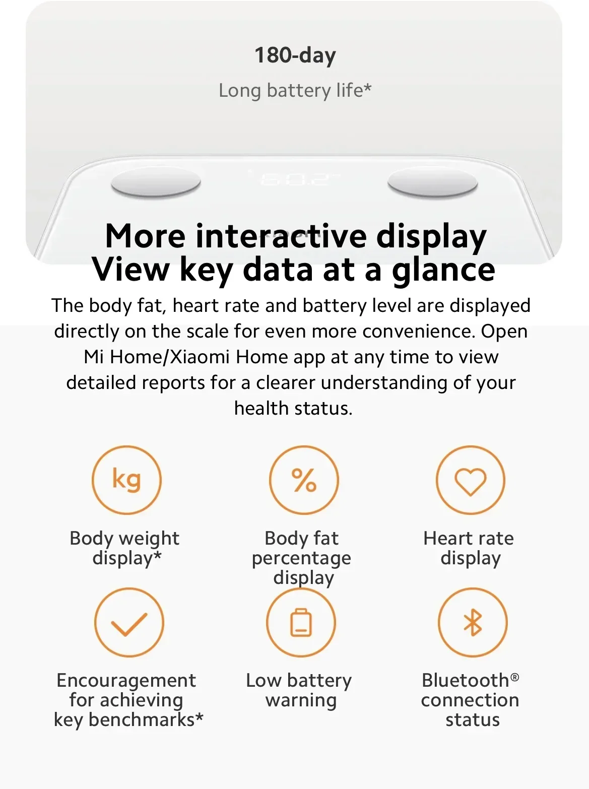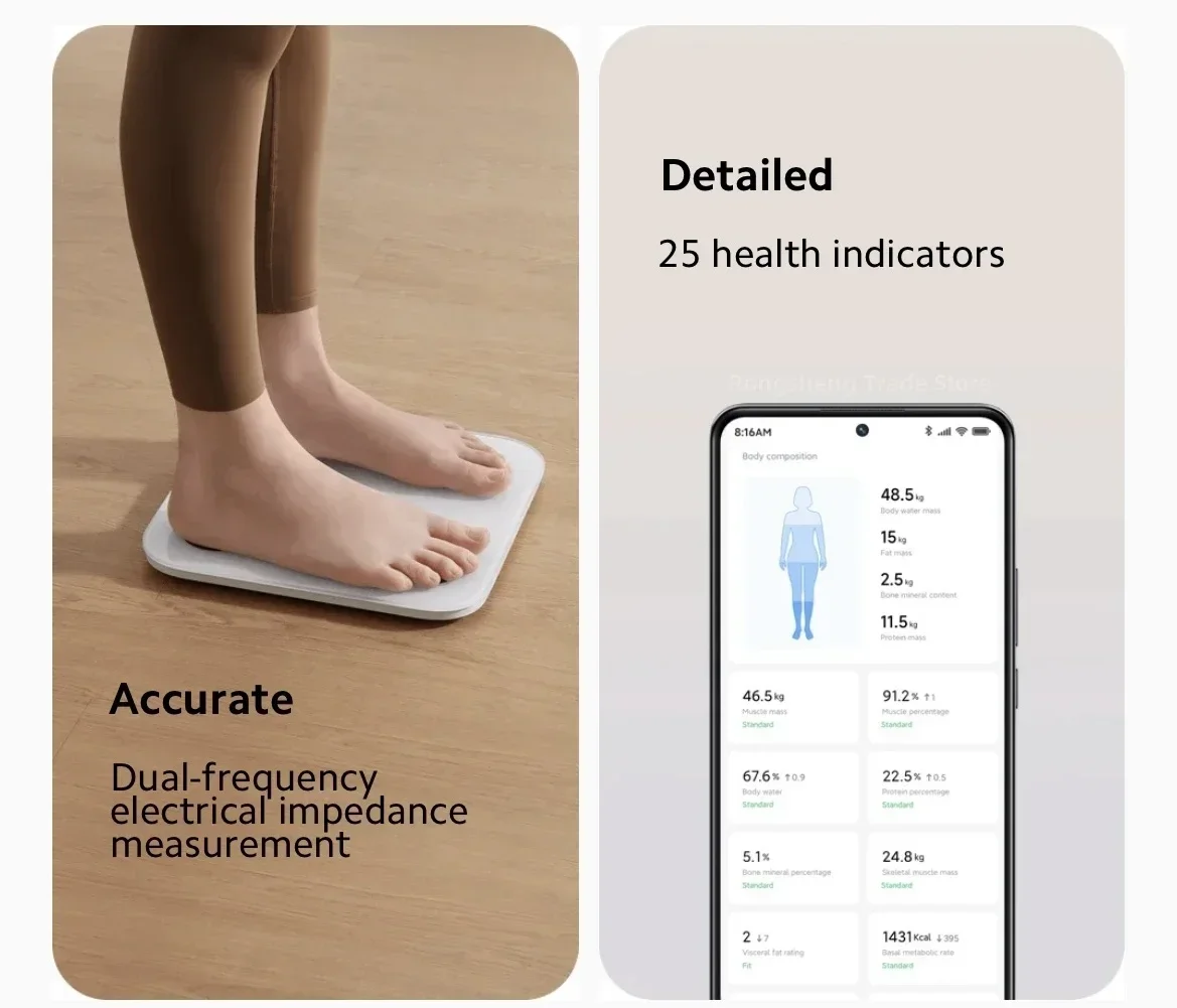 [3] 25 Body Composition Analysis Report: Includes weight, heart rate, BM (Body Mass), body score, body water, body water volume, body fat percentage, fat mass, protein mass, protein ratio, muscle mass, muscle ratio, bone salt content, bone salt ratio, visceral fat level, basal metabolic rate, lean body weight, body type, estimated waist-to-hip ratio, body age, bone muscle mass, weight control, muscle control, fat control, standard weight. Connect to the Mi Home app to view the complete body composition report.