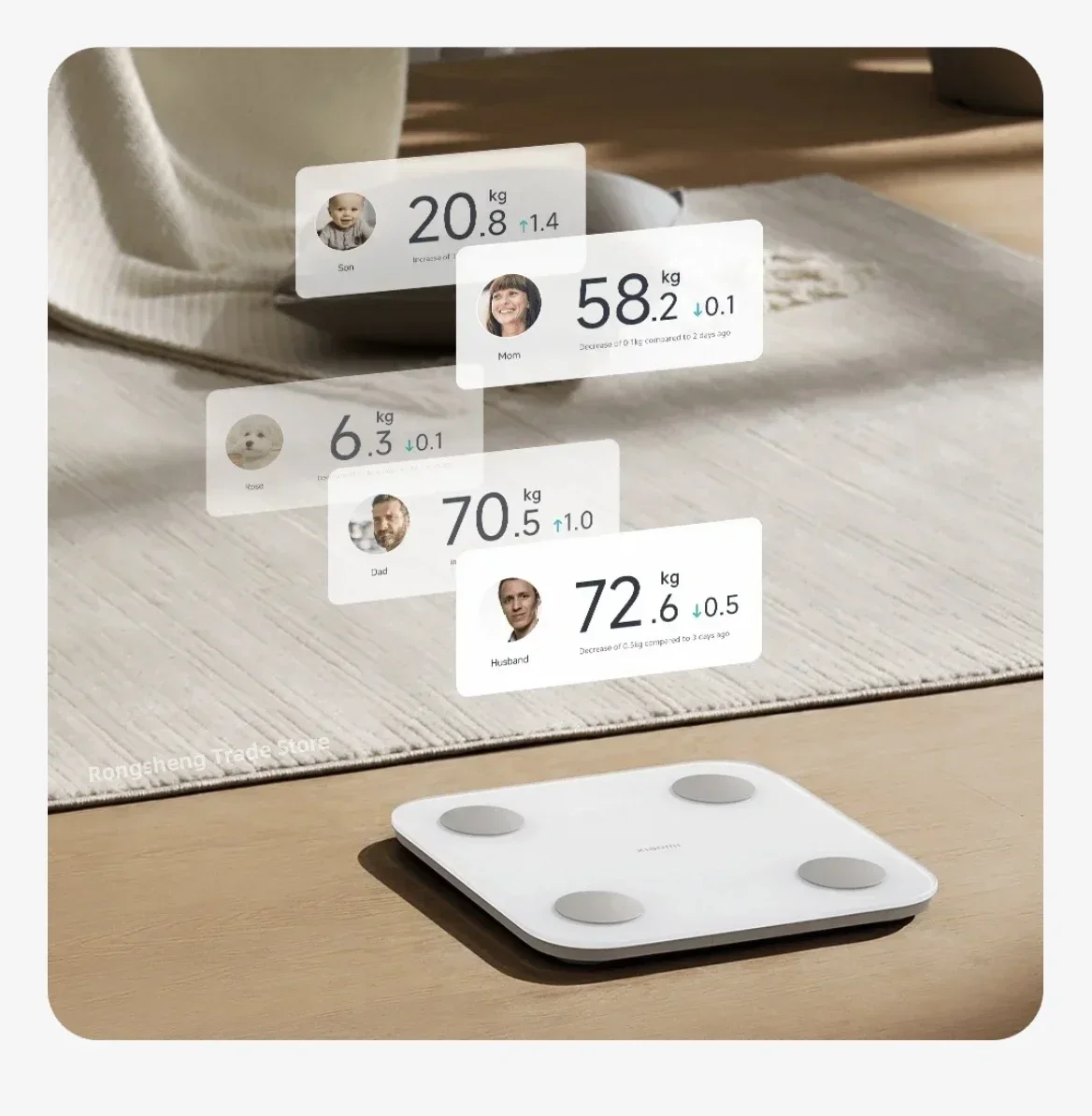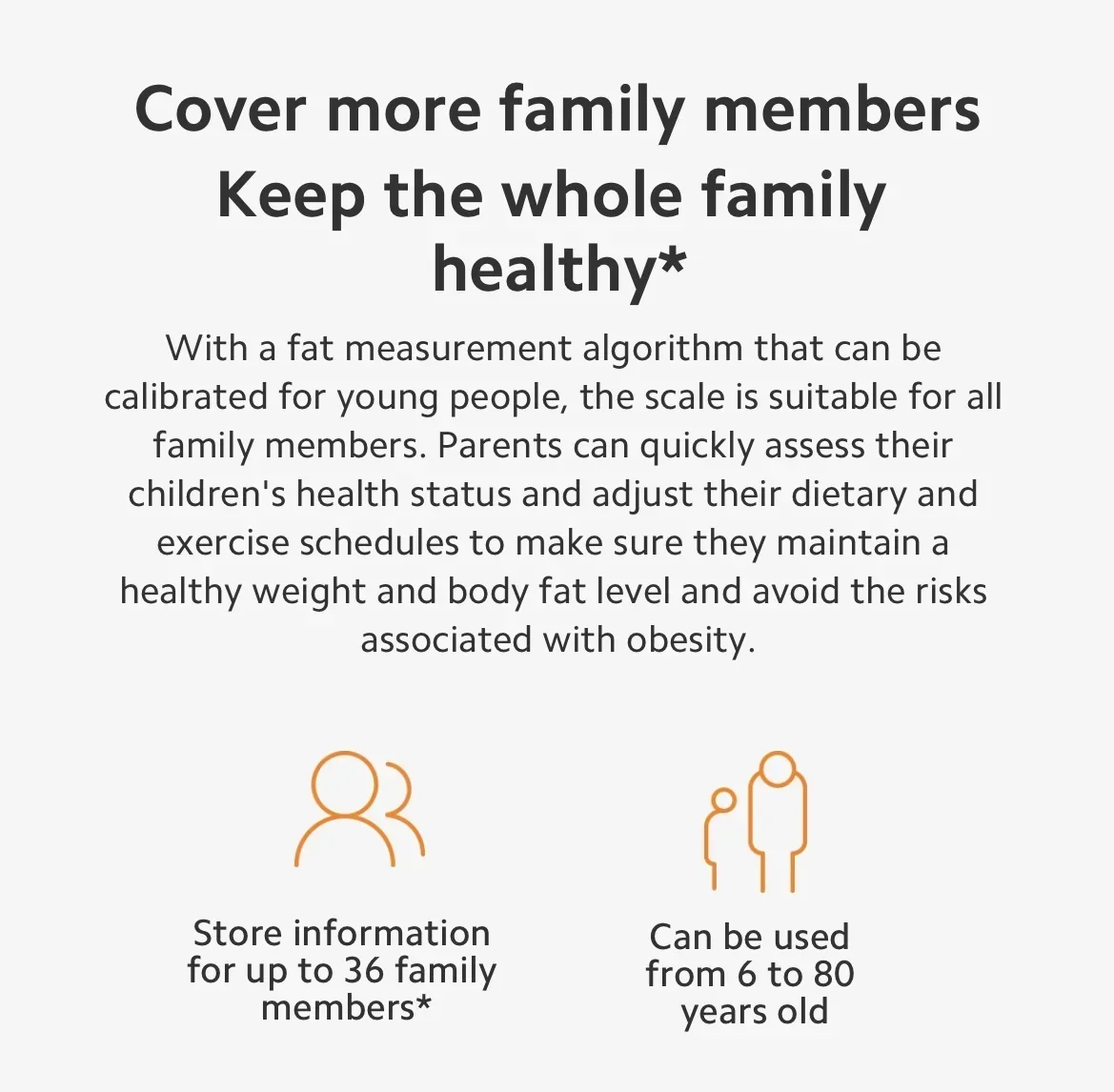 [4] Family Health Sharing: Supports users aged 6-80 to detect body weight, fat percentage, and other body composition metrics. For children under 6 and individuals over 80 with special physical conditions, only body weight measurement is supported. Due to the rapid growth of adolescents, the measurement data is for reference only.