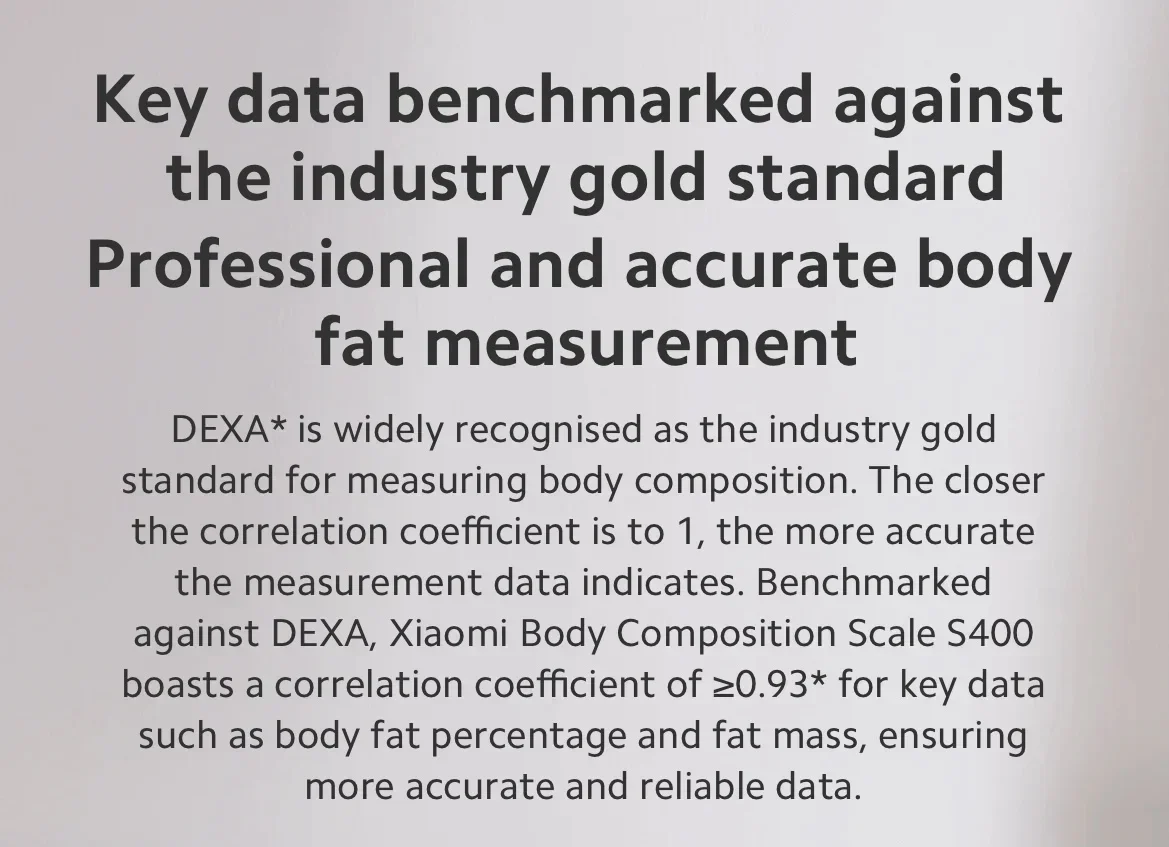 [2] Mi Body Fat Scale S400 correlation with DEXA measurement results is 0.93: Data is sourced from the "Verification and Precision Study Report of Mi Body Fat Scale S400 based on Dual-Energy X-ray Absorptiometry (DEXA)" by Dr. Meitao and the research team at Beijing Sport University's China Institute of Sport Science. Test report project number: BSU20220389.