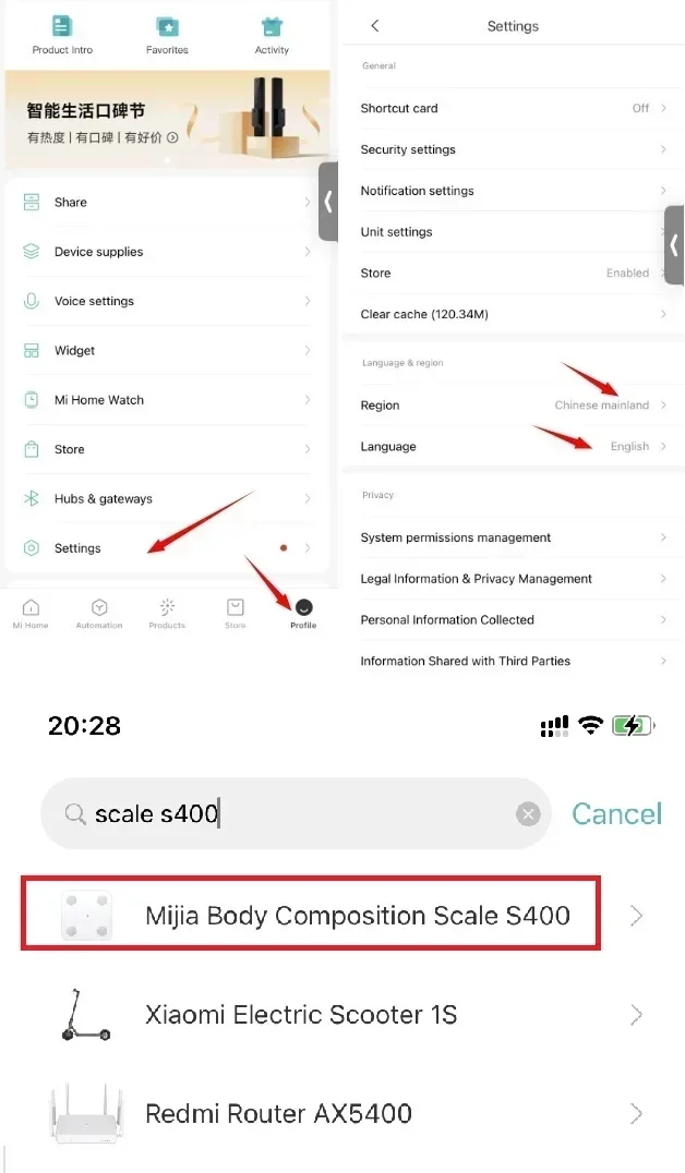 Note: Please download the MiHome application, set the country and region to Chinese Mainland, and then search for Mijia Body Composition Scale S400. Thank you