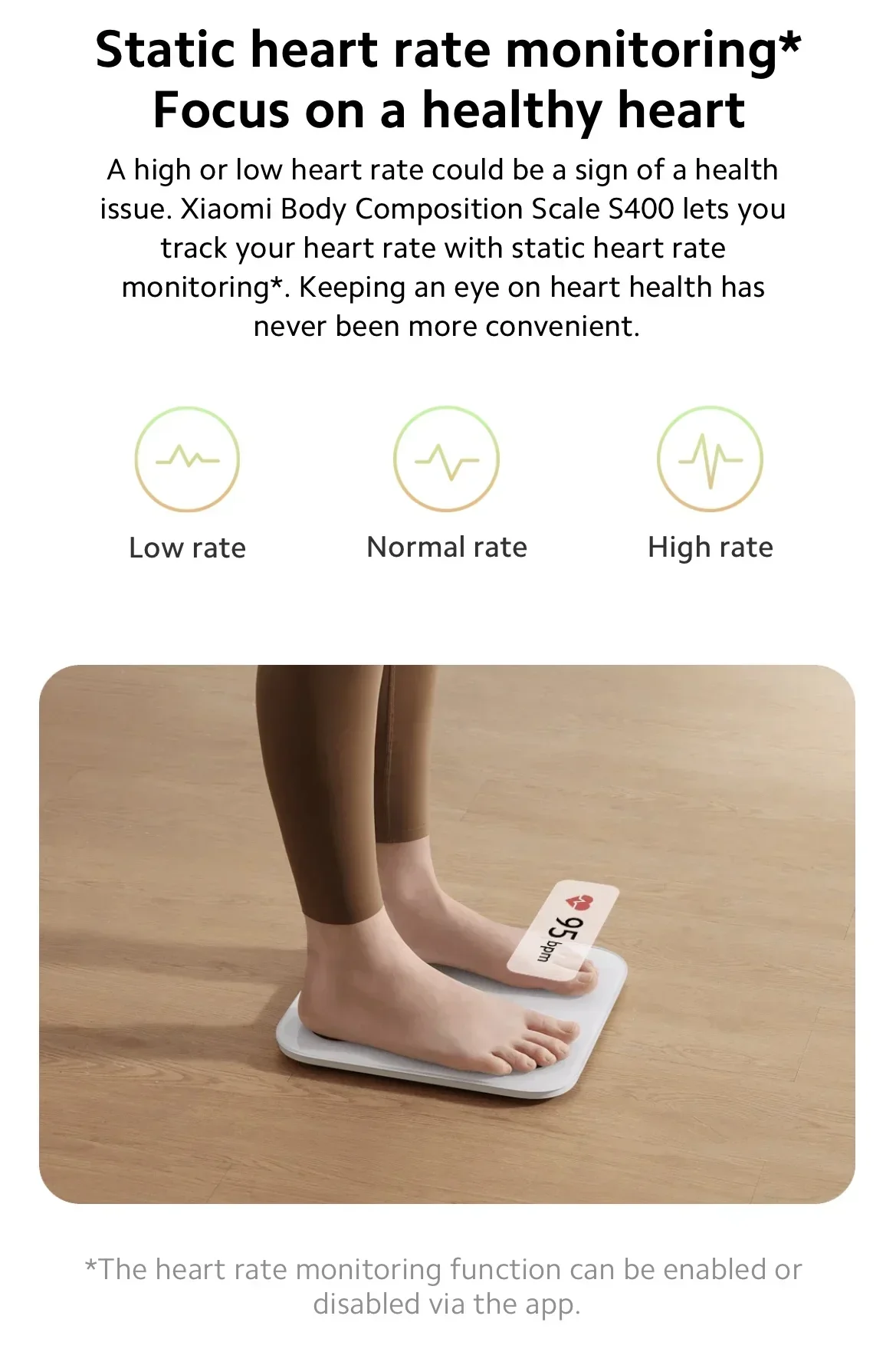 [6] Static Heart Rate Detection: Refers to the measurement of the number of heartbeats per minute in a quiet state without movement. Mi Body Fat Scale S400 performs static heart rate measurement after body fat measurement. The heart rate detection function is turned on by default and can be turned off in the Mi Home app on the device page> settings.