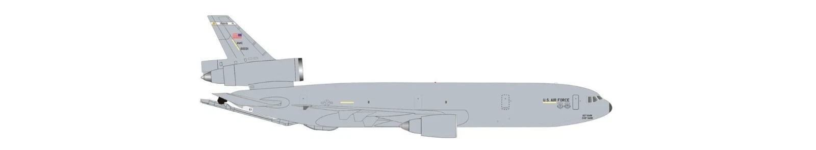 KC-10 The McDonnell Douglas KC-10 Extender is an American tanker and cargo aircraft that was operated by the United States Air Force (USAF) from 1981 to 2024. A military version of the three-engine DC-10 airliner, the KC-10 was developed from the Advanced Tanker Cargo Aircraft Program.[N 1] It incorporates military-specific equipment for its primary roles of aerial refueling and transport. It was developed to supplement the KC-135 Stratotanker following experiences in Southeast Asia and the Middle East. The KC-10 was the second McDonnell Douglas transport aircraft to be selected by the Air Force following the C-9. A total of 60 KC-10s were produced for the USAF. The Royal Netherlands Air Force operated two similar tankers from 1995 to 2021 designated KDC-10 that were converted from used civilian DC-10, instead of purpose built aircraft.