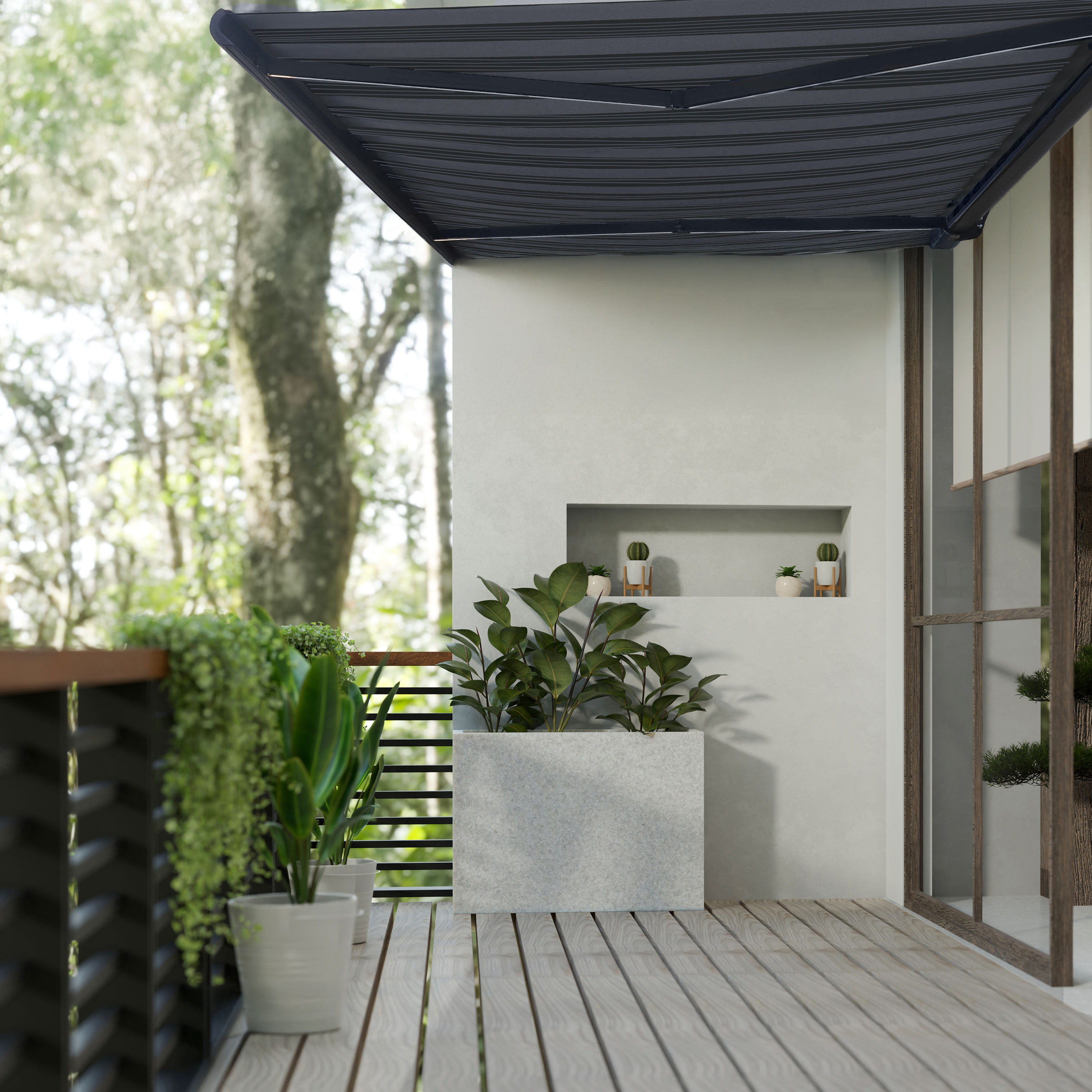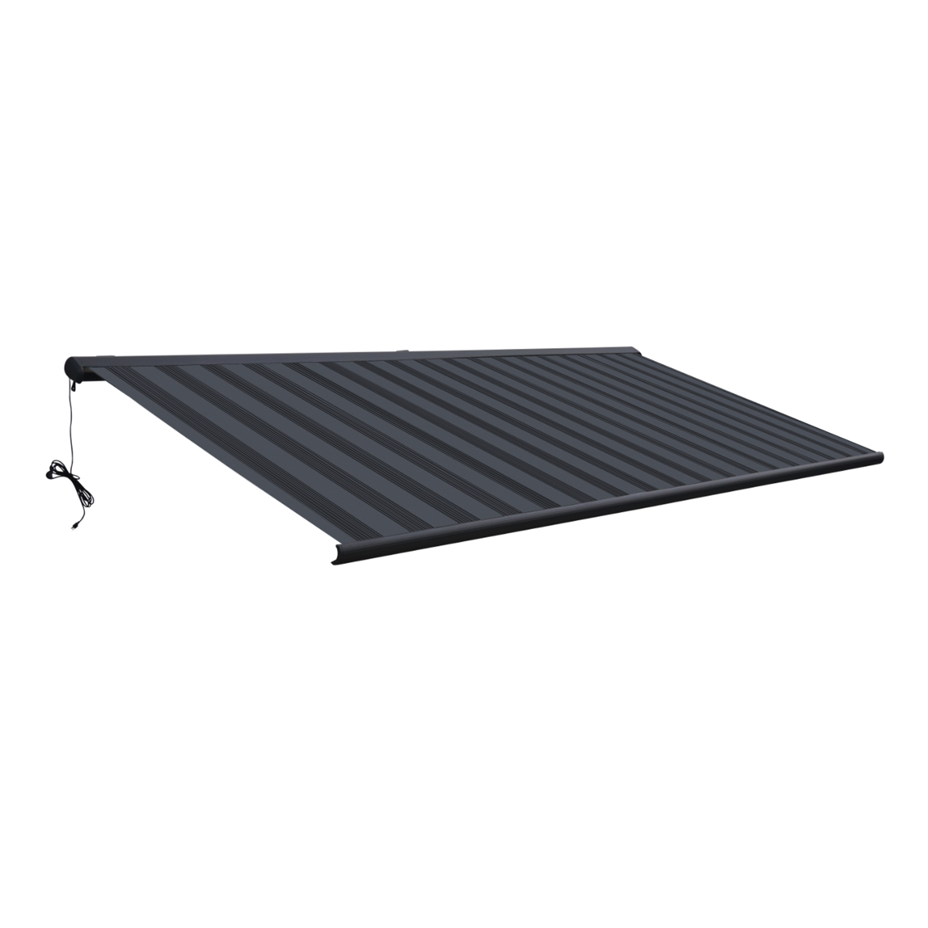 Description: Enjoy effortless shade and year-round fabric protection with this premium full cassette awning. Motorized operation with app and remote control makes it easy to extend or retract, while built-in LED lights enhance evening use. The durable, water-resistant design blocks 98% of harmful UV rays, and it arrives fully assembled for quick wall mounting and reliable, all-season comfort. Technical Specs: Enjoy effortless shade and year-round fabric protection with this premium full cassette awning. Motorized operation with app and remote control makes it easy to extend or retract, while built-in LED lights enhance evening use. The durable, water-resistant design blocks 98% of harmful UV rays, and it arrives fully assembled for quick wall mounting and reliable, all-season comfort. Technical Specs: Frame (LxW): 14 x 10 ft. Fabric Dimensions (LxW): 13.3 x 10 ft. Shade Coverage: 119 sq ft Frame Material: 6063-T5 Aluminum with Powder-Coated Finish Hand Crank Material: Q195 Steel Arm Cable Material: Zinc-Coated Steel Arm Cable Size: 4 mm Arm Spring: Dual Internal Arm Spring Fabric Material: 300 gsm, 100% Acrylic Wind Rating: Beaufort 4 UPF Rating: 50+ Frame Style: Full Cassette Motorized/Manual: Motorized Frame Color: Black Fabric Color: Black and Gray Stripe LED Lights: 2 Brightness Settings Wall Bracket Material: Steel Expansion Bolts: Zinc-Coated Steel Kit Includes: (1) Full Cassette Frame with LED Lights; (1) Awning Fabric; (1) Pre-Installed Motor; (1) Handle Crank; (1) Wi-Fi Smart Hub; (1) Remote; (1) Wall-Mounted Remote Holder; (1) Manual; (1) Set of Mounting Hardware Weight: 111.77 lbs. Assembly Required: No (only mounting required) Warranty: 2-Year Limited Warranty