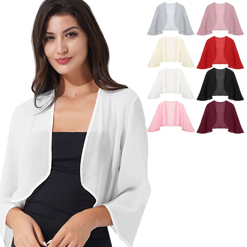 Vorne offen, ausgestellte 3/4-Ärmel, kurz geschnitten Länge, einfarbig.
