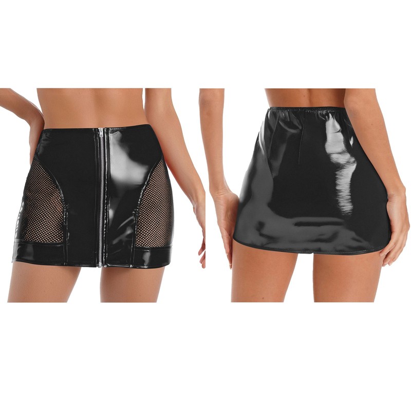 Women's Shiny Pu Leather Sheer Mesh Patchwork Bodycon Miniskirt Nightclub Skirts