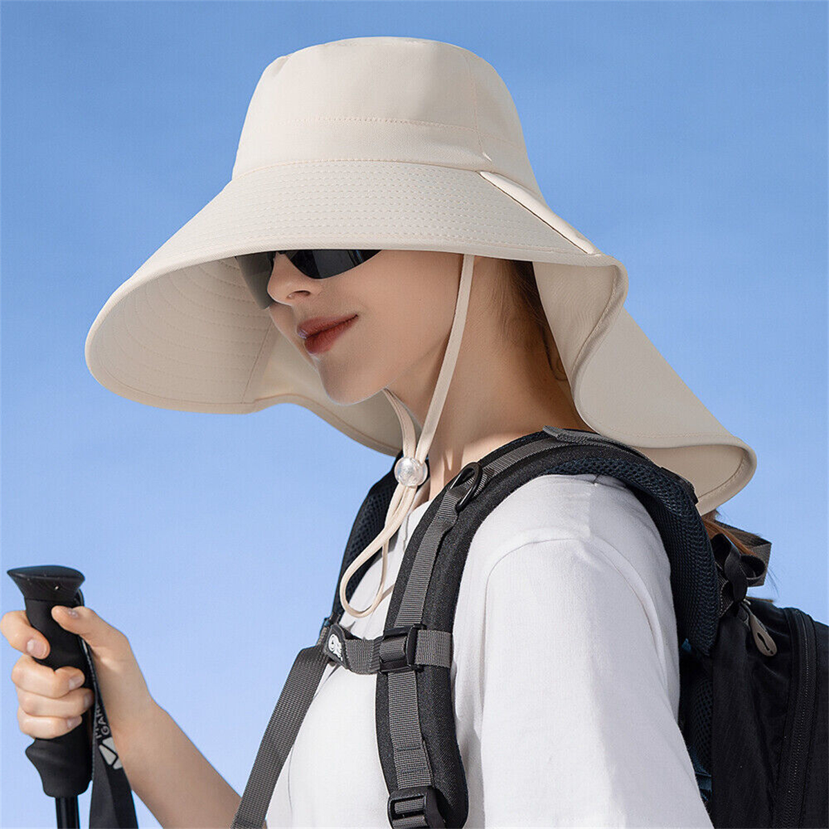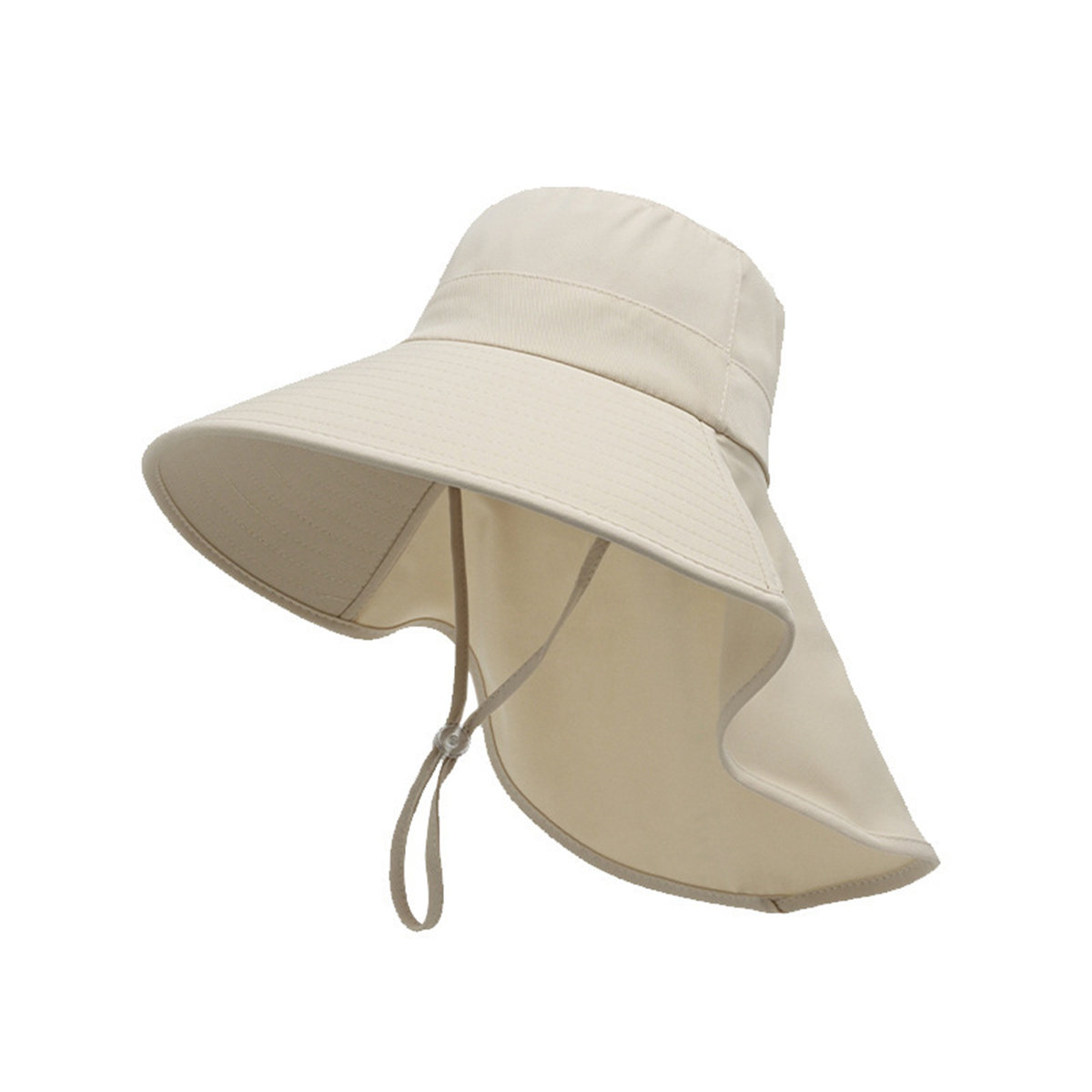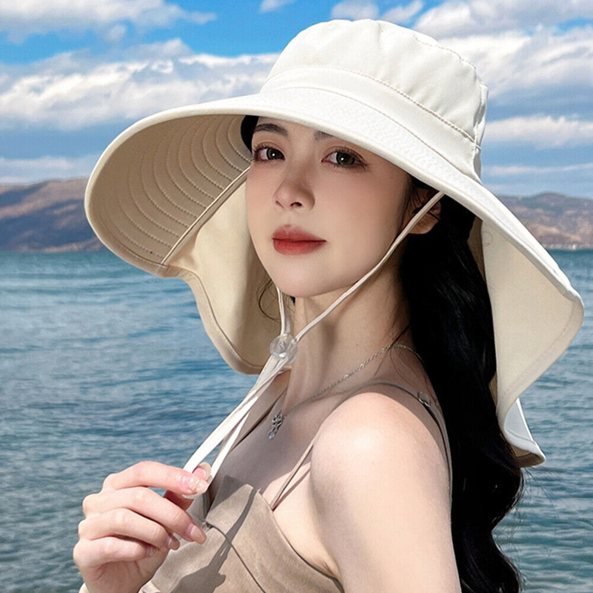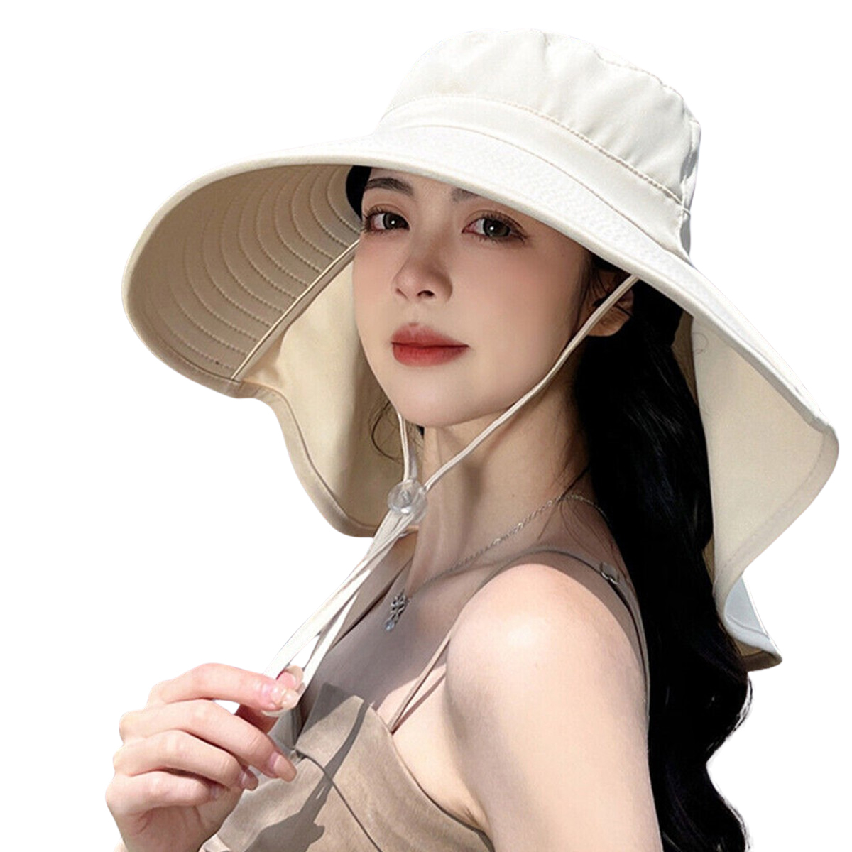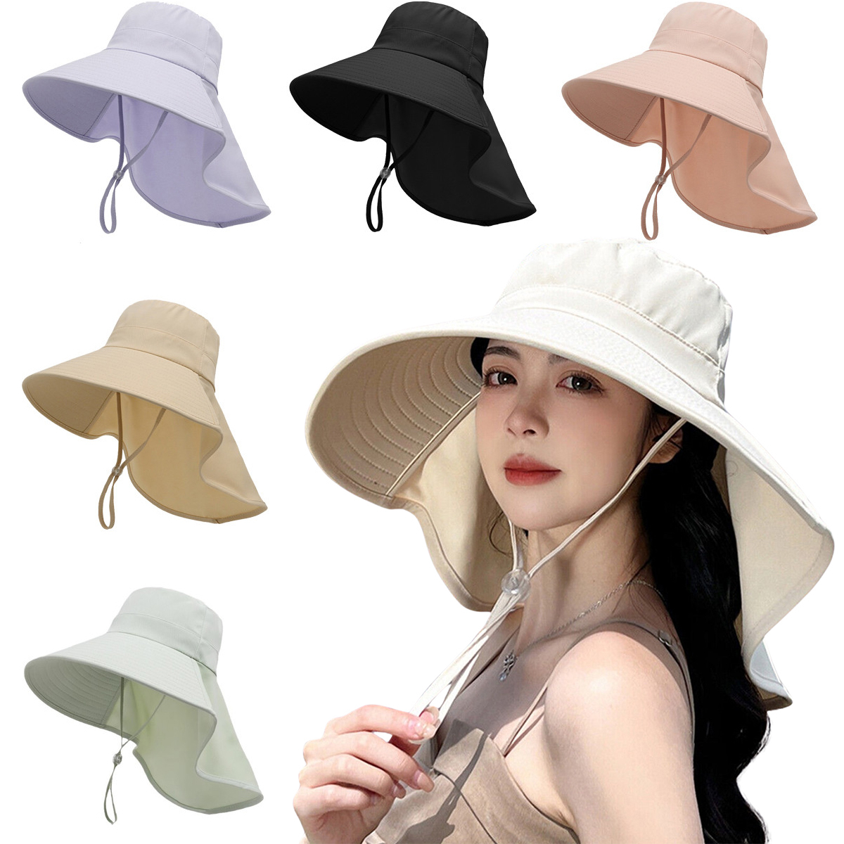 Women Bucket Sun Hat Wide Brim Neck Cover Flap Ponytail Summer Beach Fishing Cap