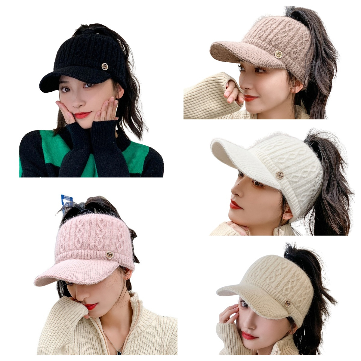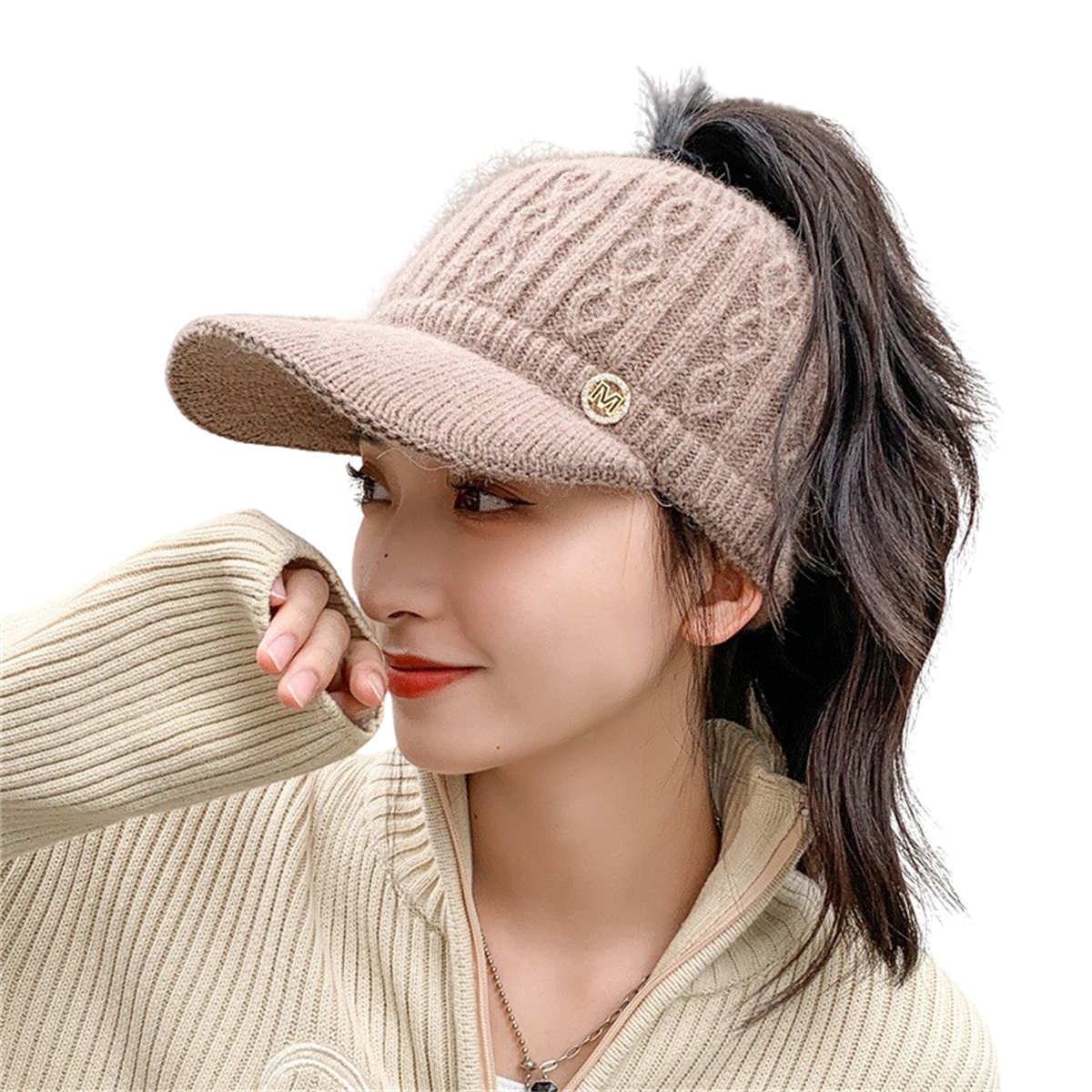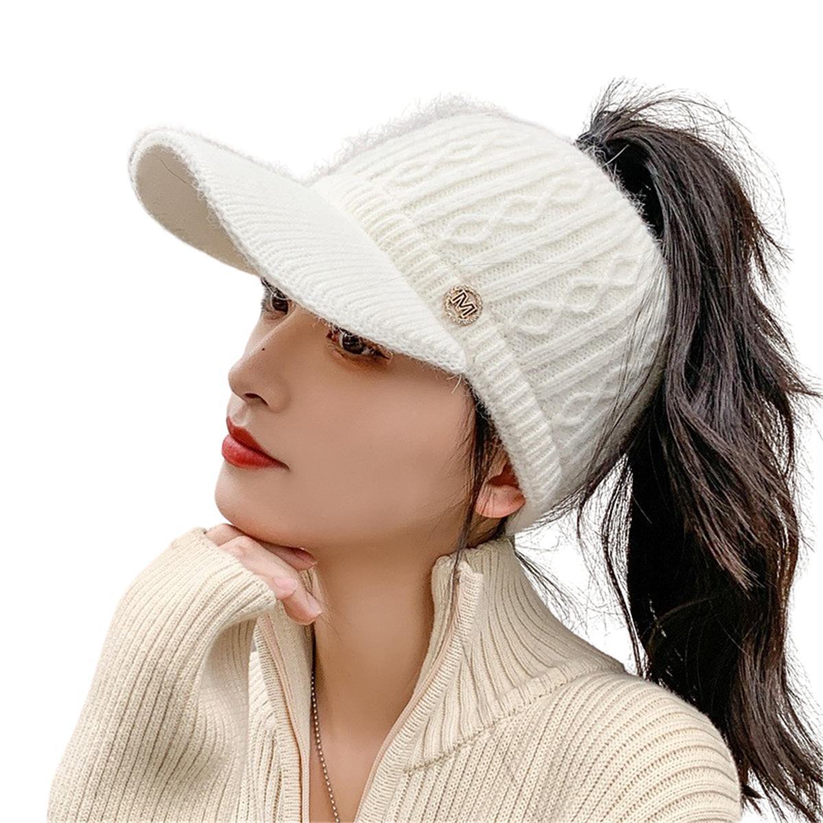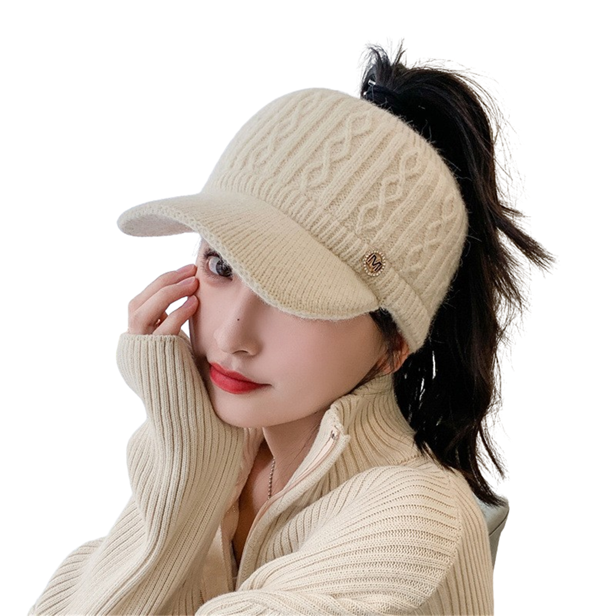 Knit Beanie Hat for Womens High Ponytail Cap Winter Warm Visor Brim Crochet Hat