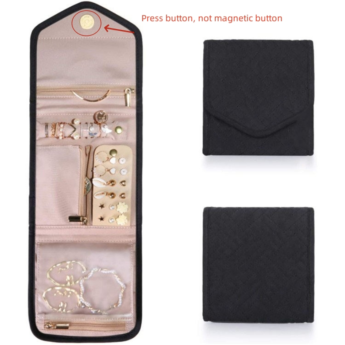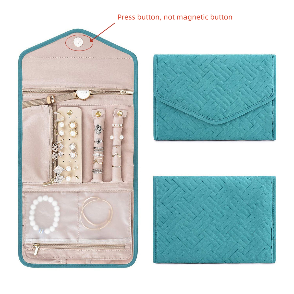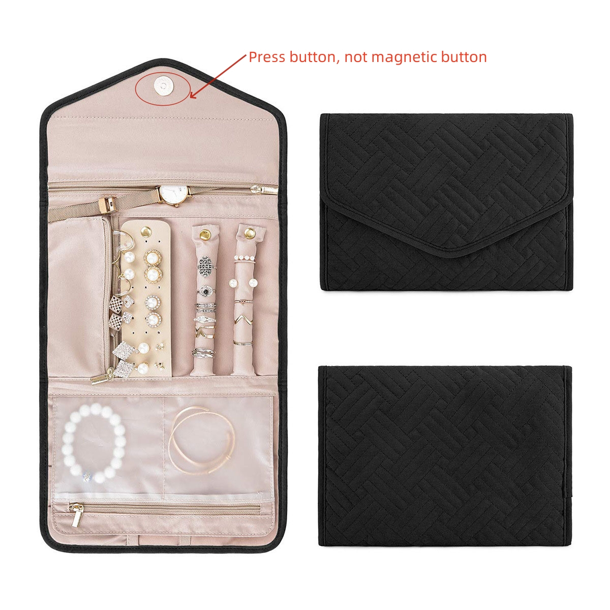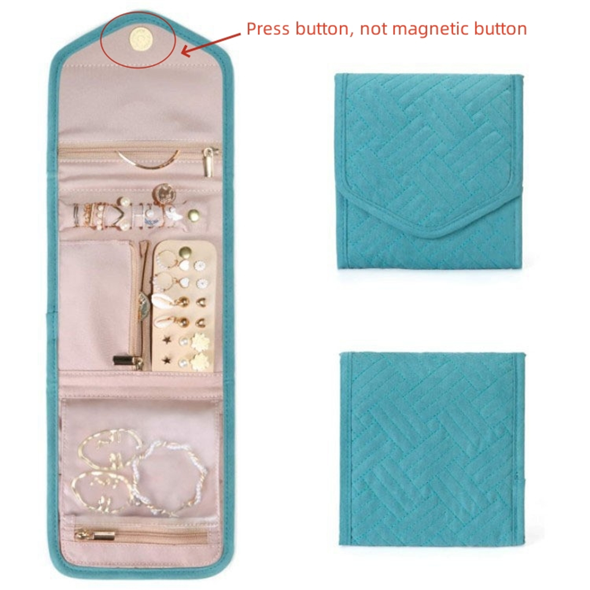 2. The jewelry storage bag is easy to pack and store with its folding design. With pockets and press button, our jewelry travel case for women to ensure that your jewelry stays in place during travel.