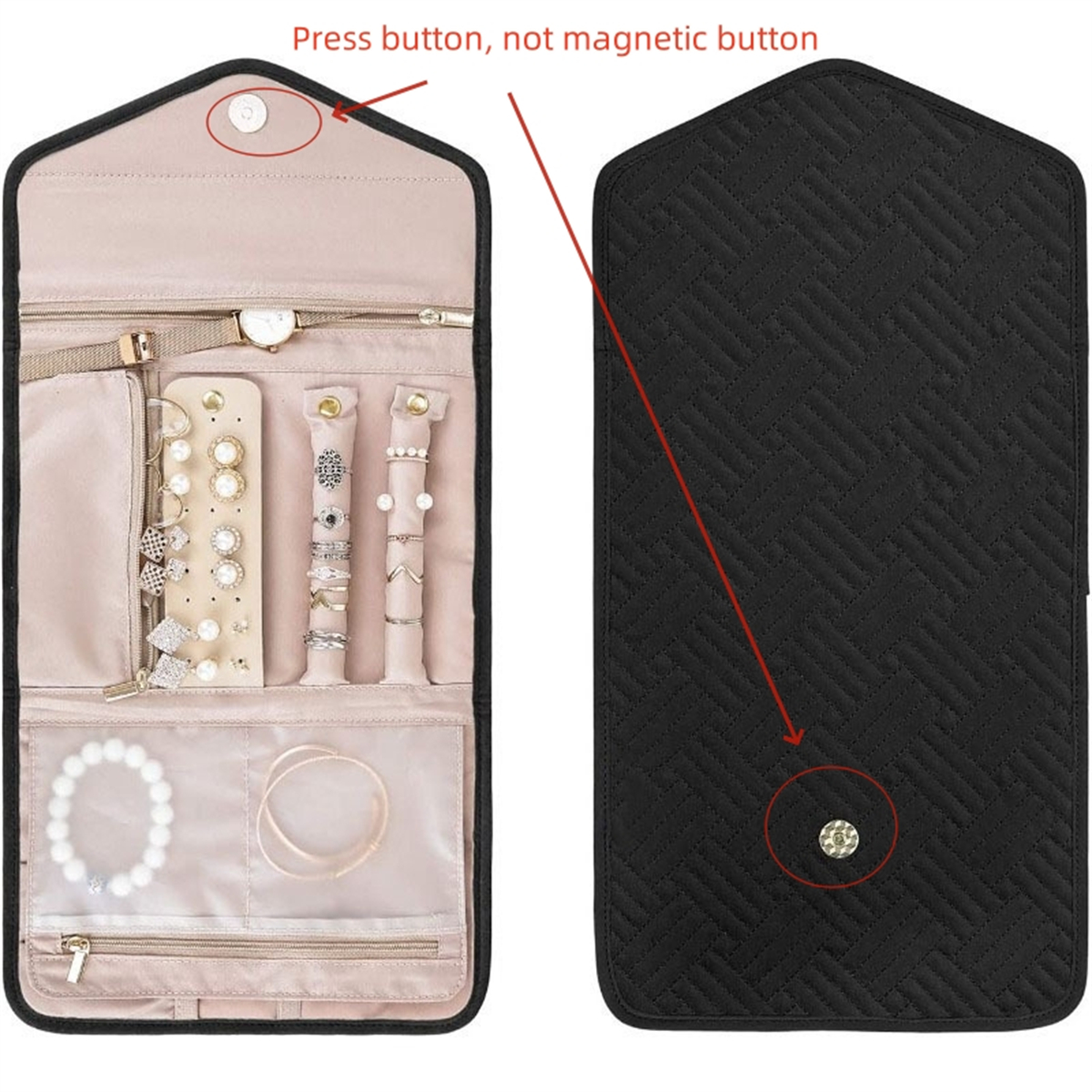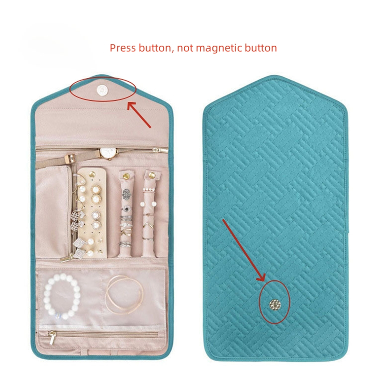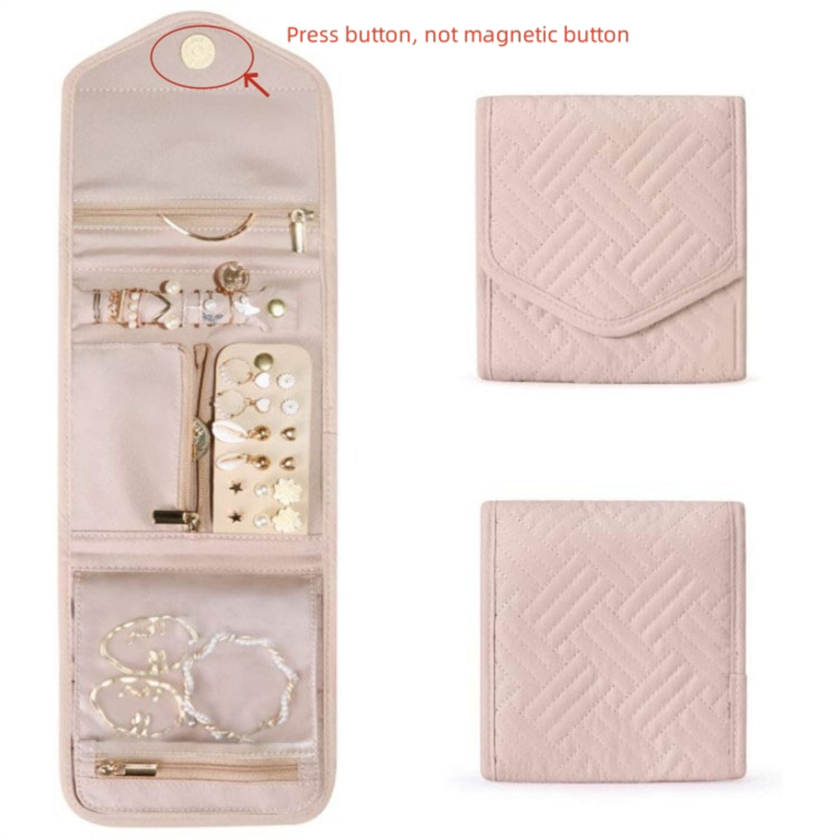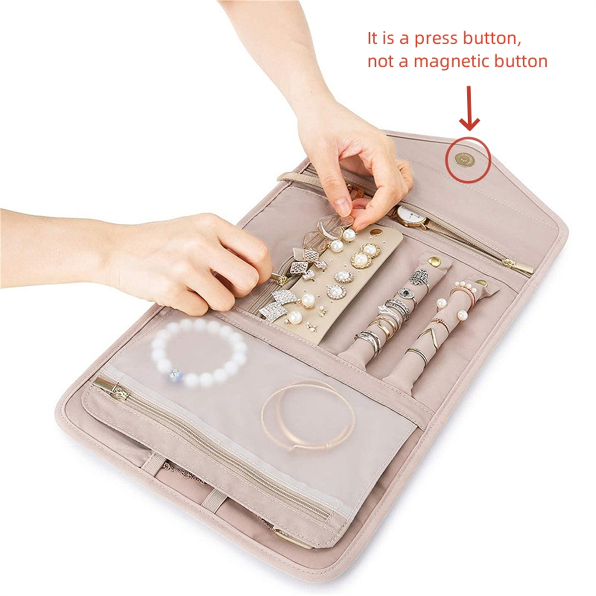 2. The jewelry storage bag is easy to pack and store with its folding design. With pockets and press button, our jewelry travel case for women to ensure that your jewelry stays in place during travel.