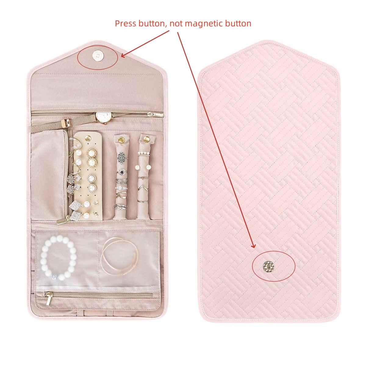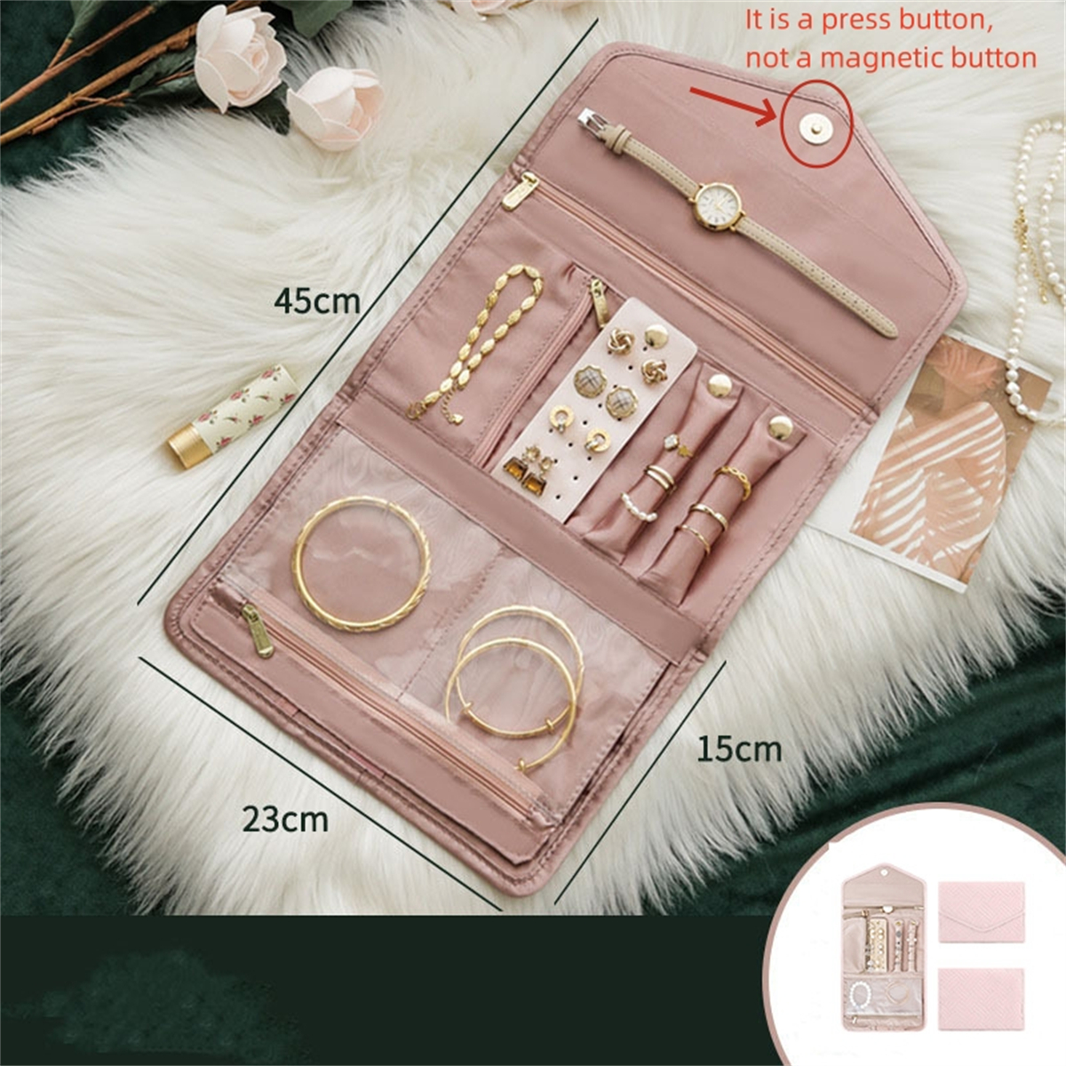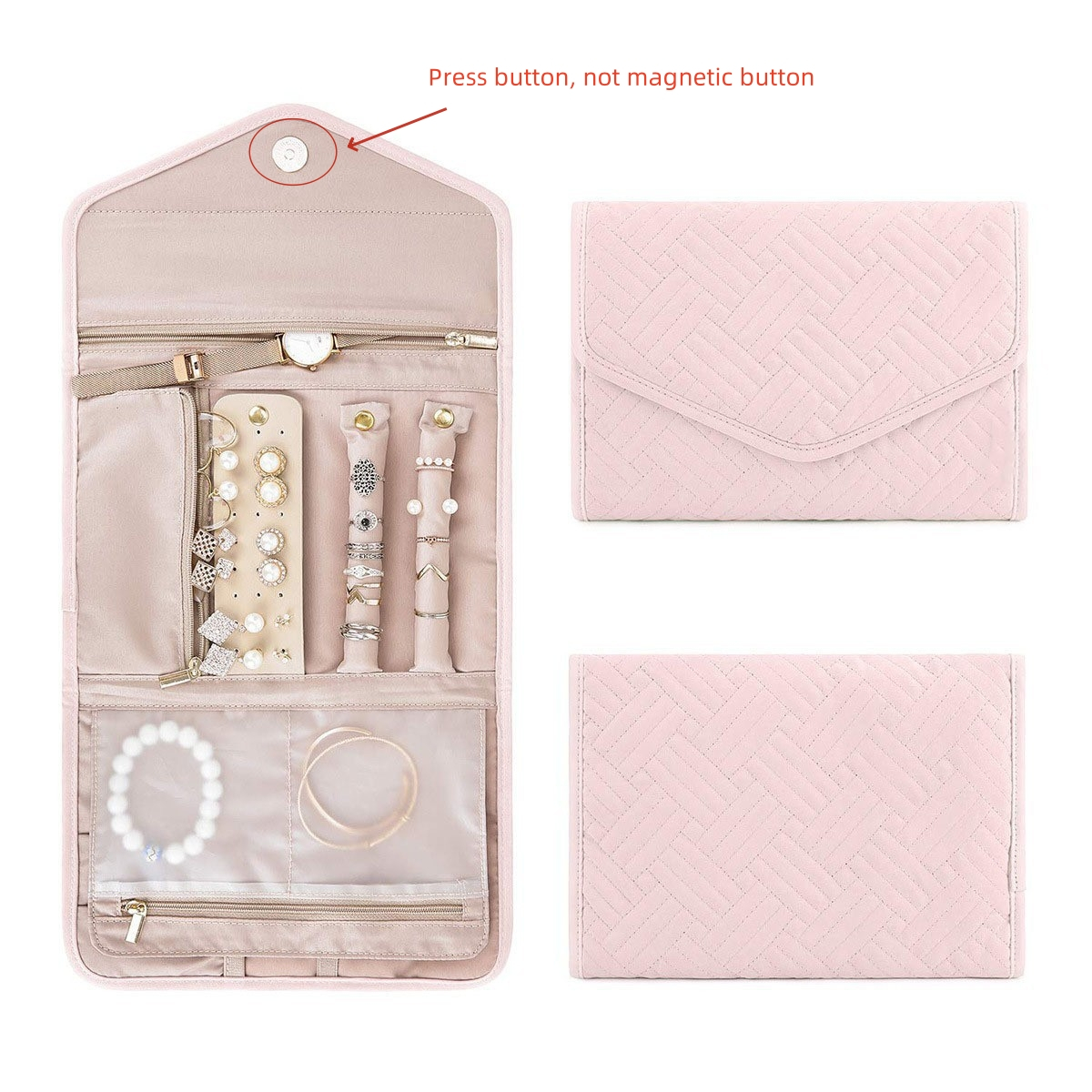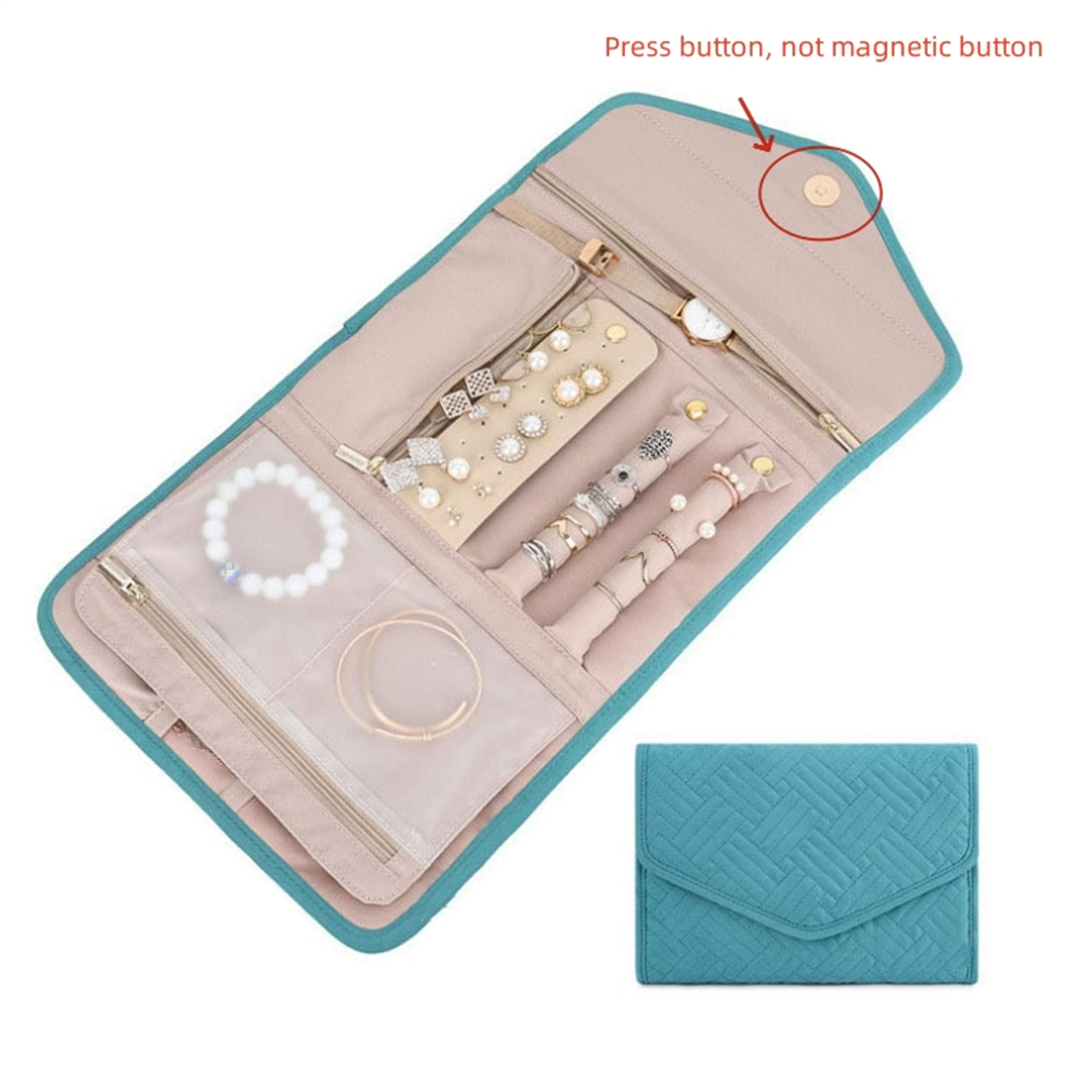2. The jewelry storage bag is easy to pack and store with its folding design. With pockets and press button, our jewelry travel case for women to ensure that your jewelry stays in place during travel.
