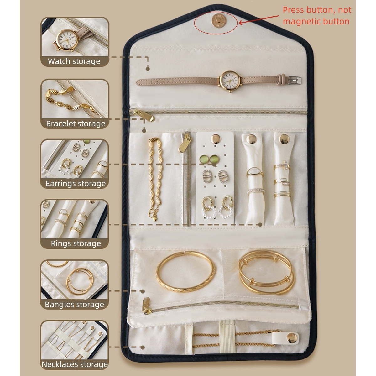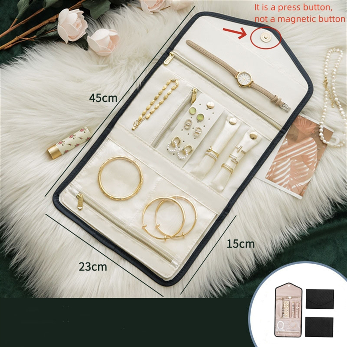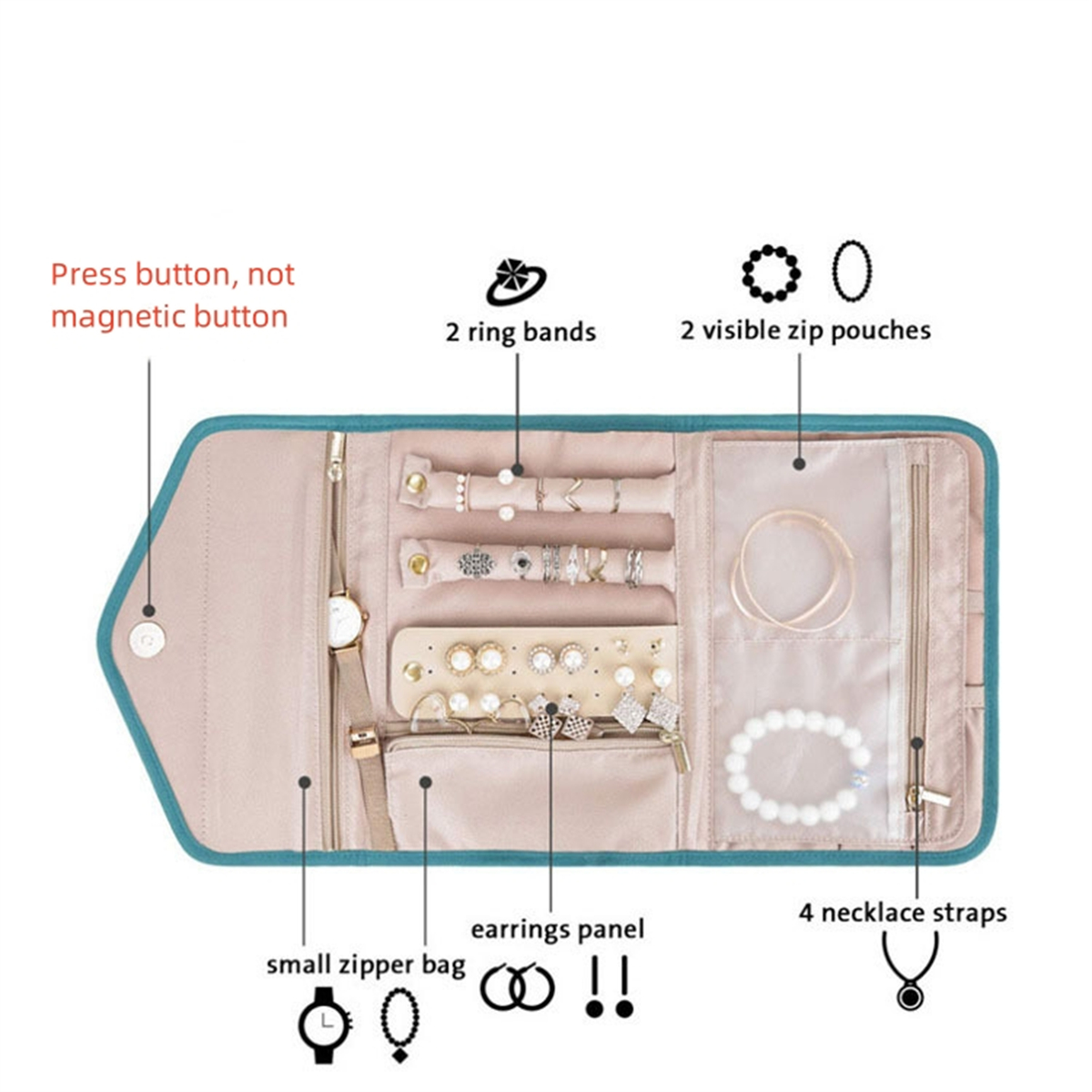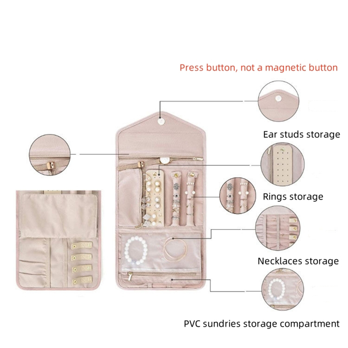 2. The jewelry storage bag is easy to pack and store with its folding design. With pockets and press button, our jewelry travel case for women to ensure that your jewelry stays in place during travel.