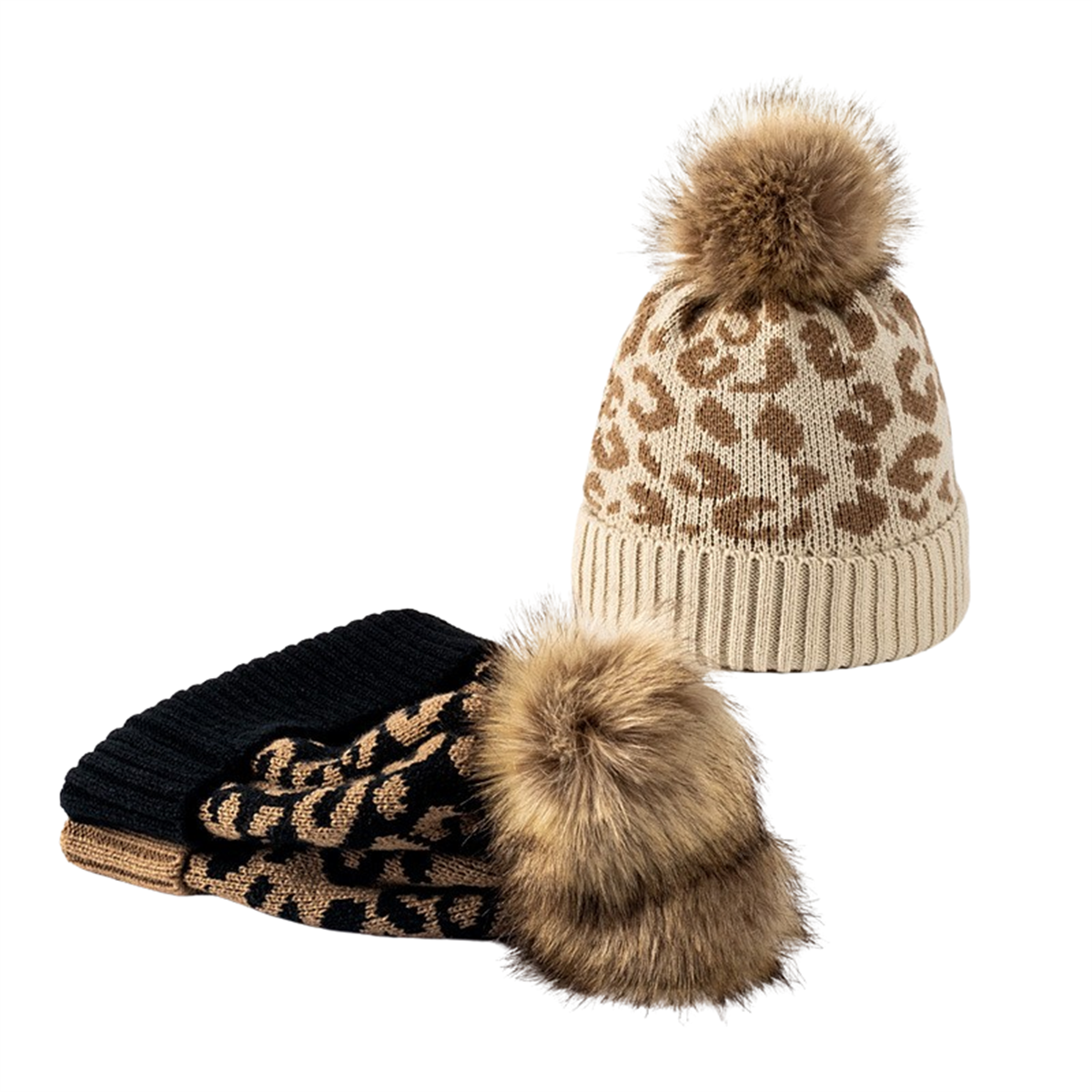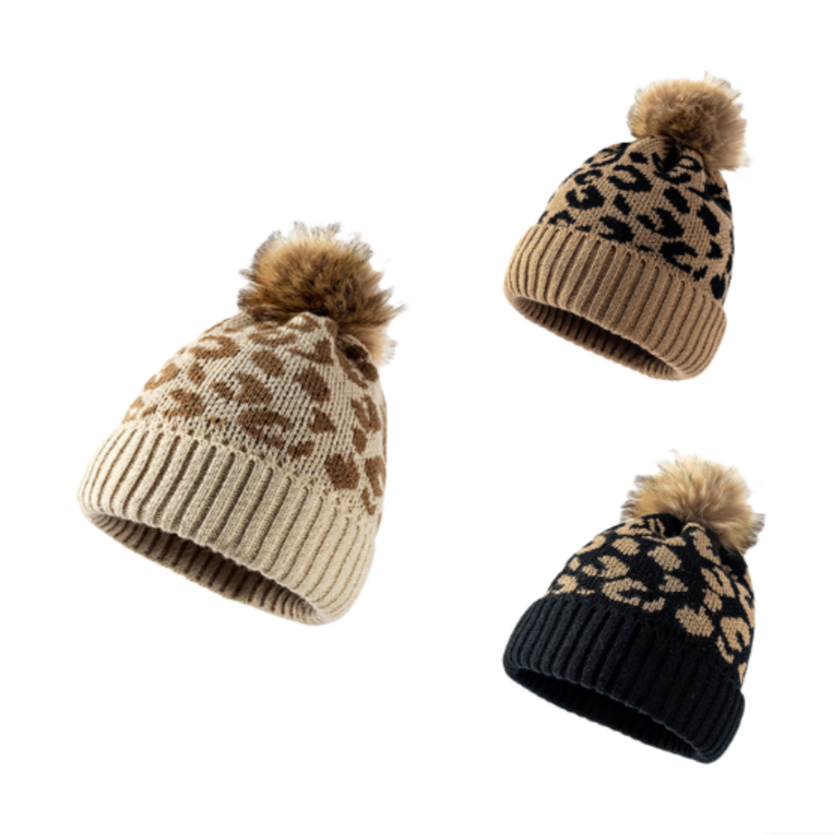 Women Leopard Print Beanie Winter Warm Knit Hat With Fur Pom Pom & Curled Edges