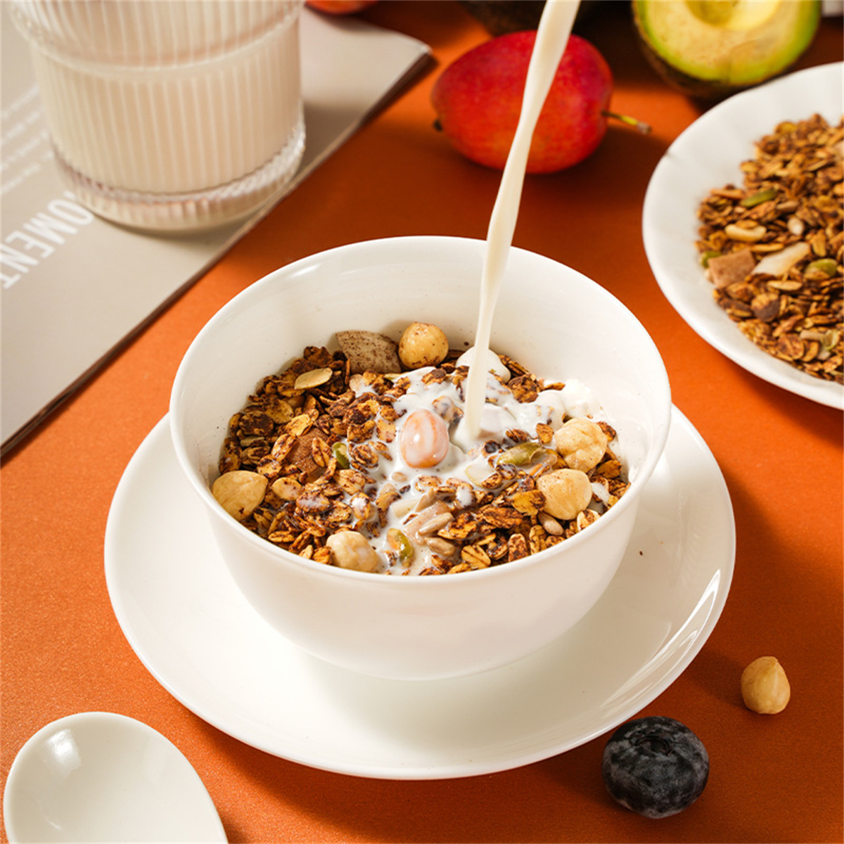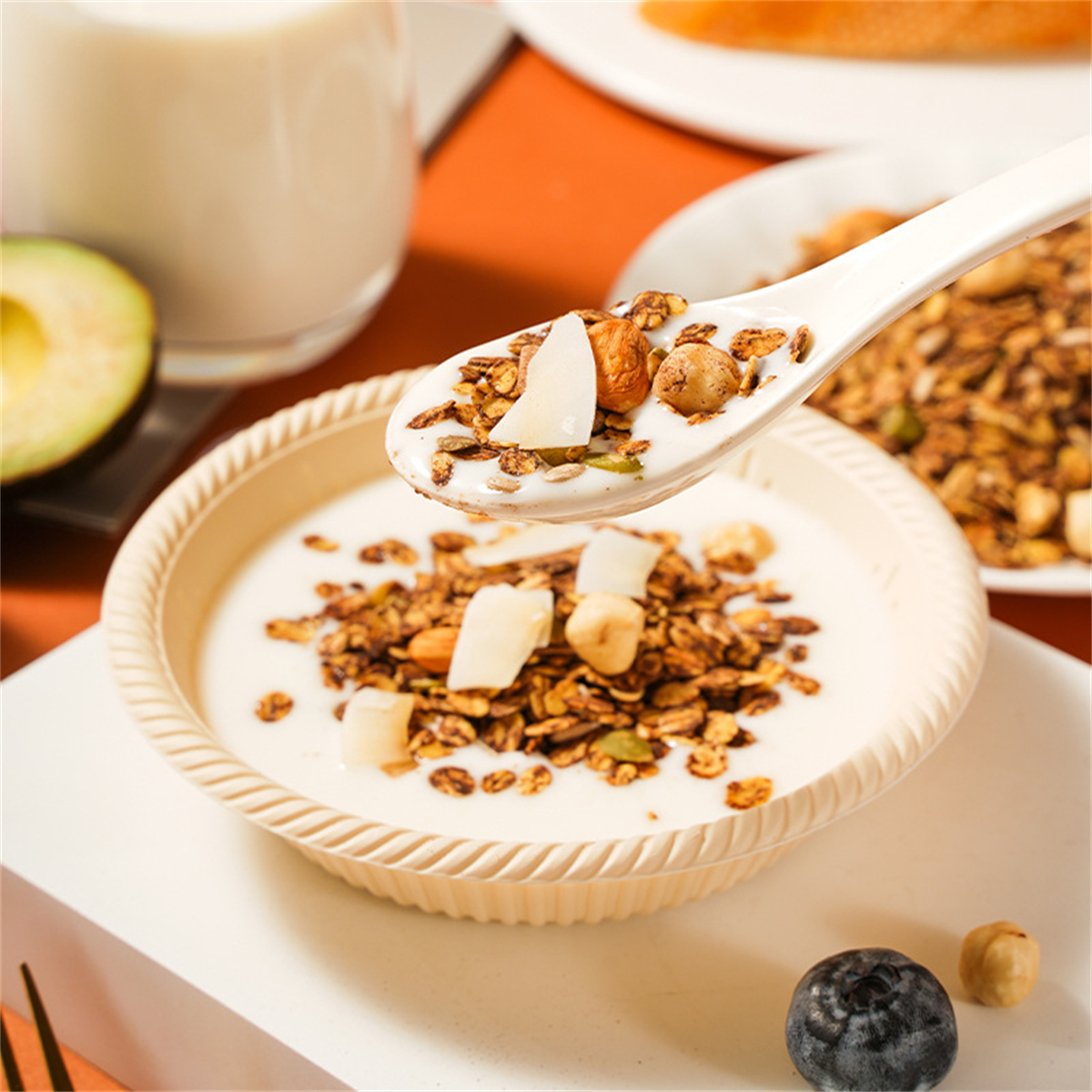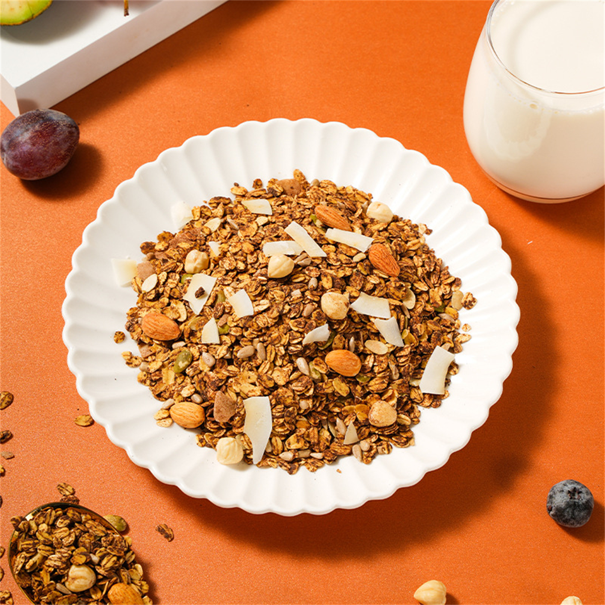 Ingredients and ingredients: Cocoa baking cereal (oatmeal, high fructose corn syrup, maple syrup, vegetable oil, cocoa powder, edible sea salt, coconut powder, honey), hazelnuts, almonds, melon seeds, pumpkin seeds, coconut flakes.