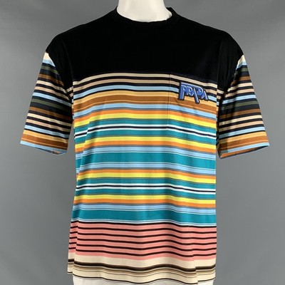 PRADA Size XL Black Multi-Color Stripe Cotton Crew Neck T-shirt IN-STORE ID: 127444PRADA t-shirt in a black cotton fabric featuring multi-color horizontal stripes, one pocket with Prada applique, and a crew neck. Made in Romania. Original Retail Price (if known): $0.00 Category: T-shirt More Details Brand: PRADA Size: XL Gender: Male Color: Black Color 2: Multi-Color Pattern: Stripe Fabric: Cotton Style: Crew-Neck Country of Origin: Romania Age Group: Adult