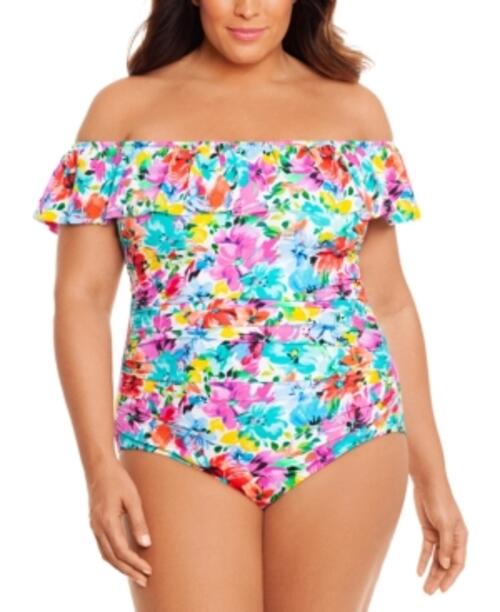 Dive into off-the-shoulder chic with this vivid look, a plus size swimsuit in a vibrant print. Tummy controls helps smooth your silhouette.