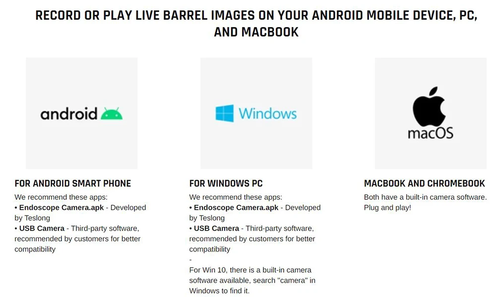 【ANDROID, MAC,PC COMPATIBLE】 - Includes a 2-in-1 USB & Micro-USB plug and a Type-C adapter, so you can record, or play, live barrel images on your Android mobile device, PC computer, or MacBook (OSX). PLEASE NOTE This USB version DOES NOT WORK with iPhone or iPad (iOS).