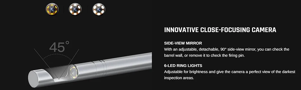 【SIDE-VIEW MIRROR】 - This bore scope with 6 adjustable LED ring light, Come with Detachable 90° side-view mirror. You can check the barrel wall, or remove it to examine the firing point. Includes 3 mirrors in case you lose or break one!