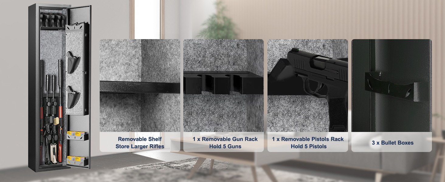 Notre coffre-fort pour armes peut stocker jusqu'à 5 armes et un minimum de 4 pistolets. Les supports d'armes amovibles permettent des options de stockage flexibles pour s'adapter à vos besoins évolutifs.
