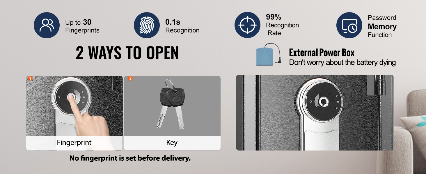 Verrouillage intelligent par empreinte digitale : le coffre-fort pour armes d'épaule VEVOR est doté d'un verrouillage intelligent par empreinte digitale pour un accès rapide et sécurisé en une seconde seulement. Vous pouvez enregistrer jusqu'à 30 empreintes digitales pour un accès facile. En cas d'urgence, le coffre-fort comprend aussi deux clés d'urgence, afin que vous n'ayez jamais à vous soucier de l'épuisement de la batterie.