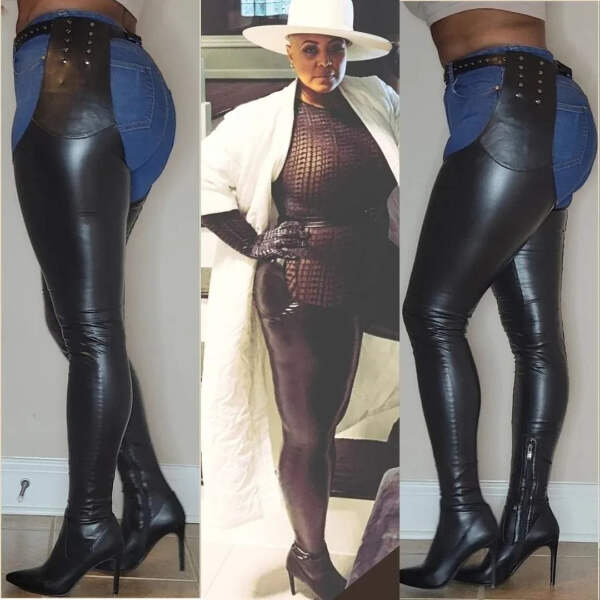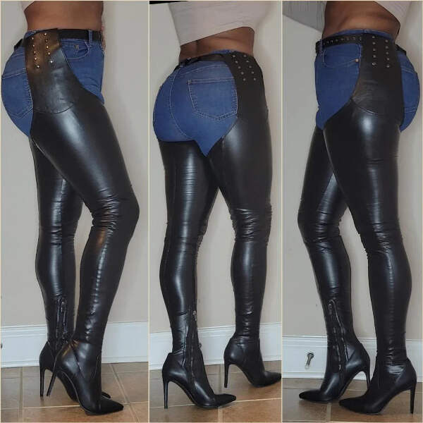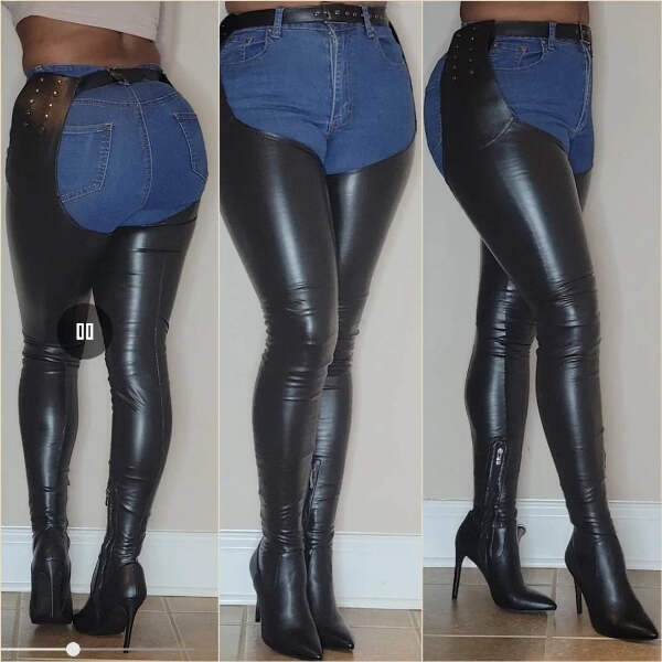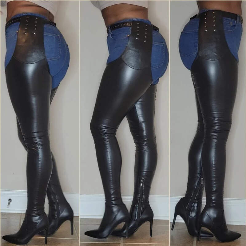 Woman thigh chap boots with belt attached. flattering boots great or a night on the town. Faux leather material.