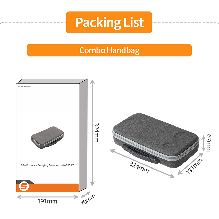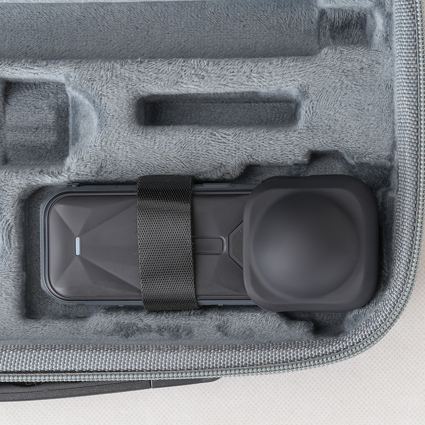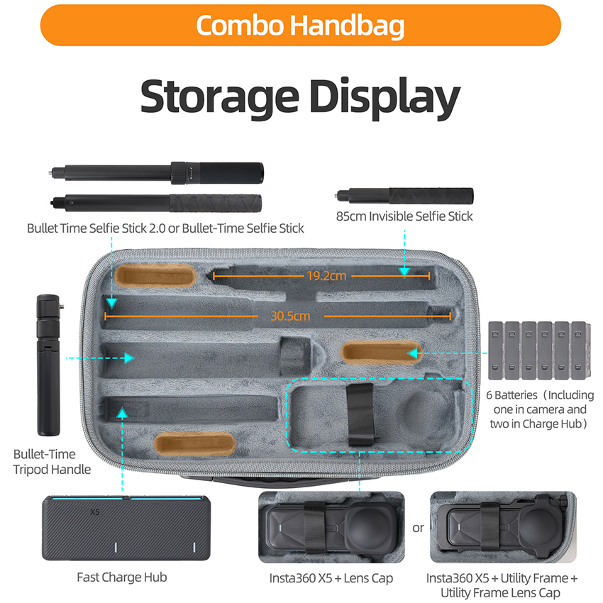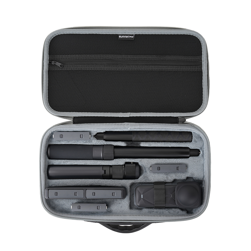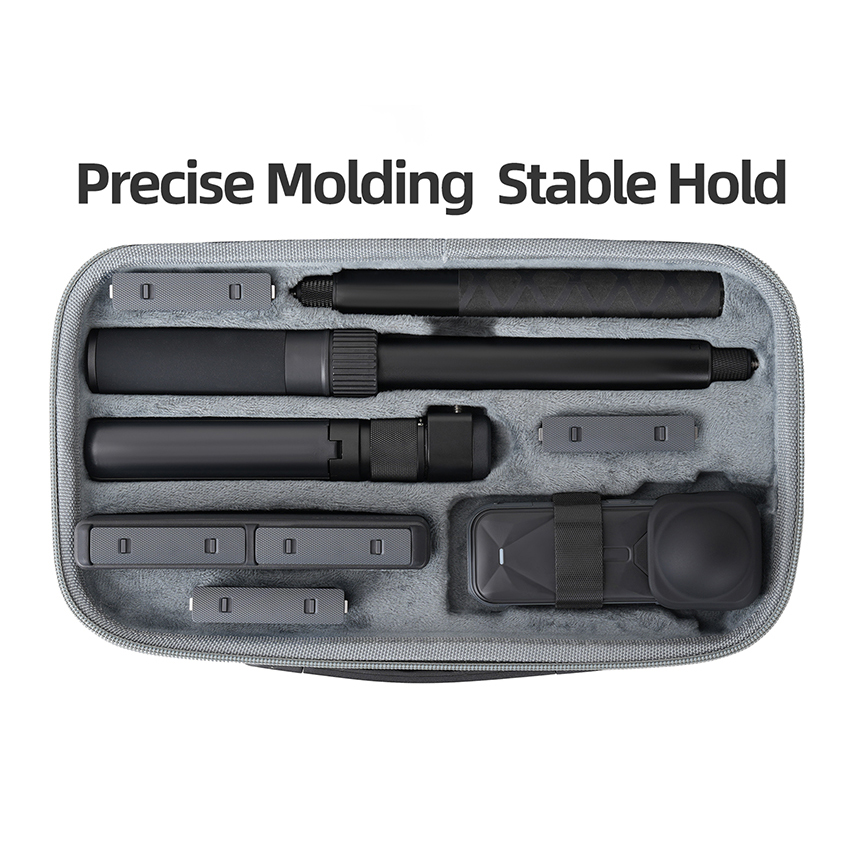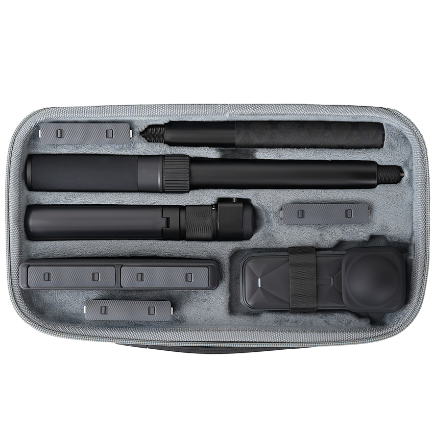 l The Portable Kit Carrying Case can organize X5 Body + Lens Case or X5 Body + Expansion Frame + Expansion Frame Lens Case, 85cm Invisible Selfie Stick, Bullet Time Grip, Bullet Time Selfie Stick 2.0 or Bullet Time Selfie Stick, 6pcs Batteries, Charge Manager, as well as Data Cables, Memory Cards, and other Camera Accessories