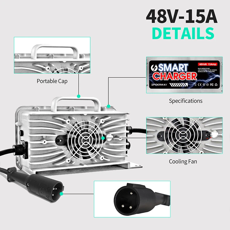 - 15 Amp Rapid Charger/Lithium: Spiderway 48Volt 15Amp Club Car DS & Precedent golf cart lithium battery charger with 3-pin Round plug is designed for fast, convenient and safe charging in a variety of situations.