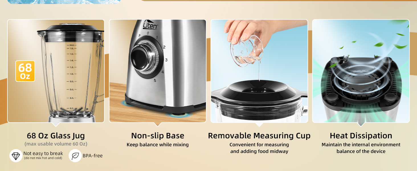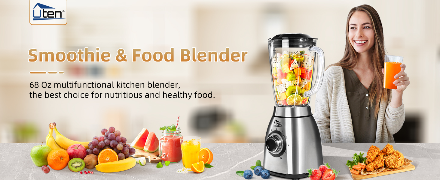 Uten blender is equipped with 800W motor, more powerful than many blenders on the market, plus a 304 stainless steel blade with 6 blades, the efficiency can be tripled, which can achieve a fast and even mixing effect and the mixing is very delicate
