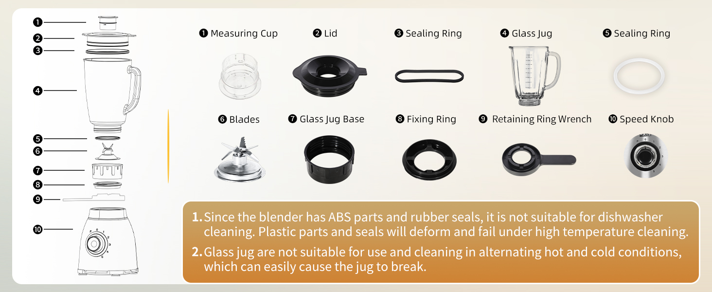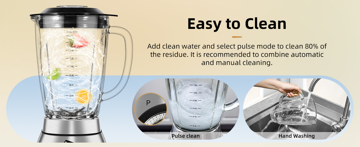 The blender bottom has non-slip feet and also has an overheating protection function, which makes the operation more stable and safe. All parts (including blade) can be disassembled and washed in the dishwasher, except the base, making cleaning easier