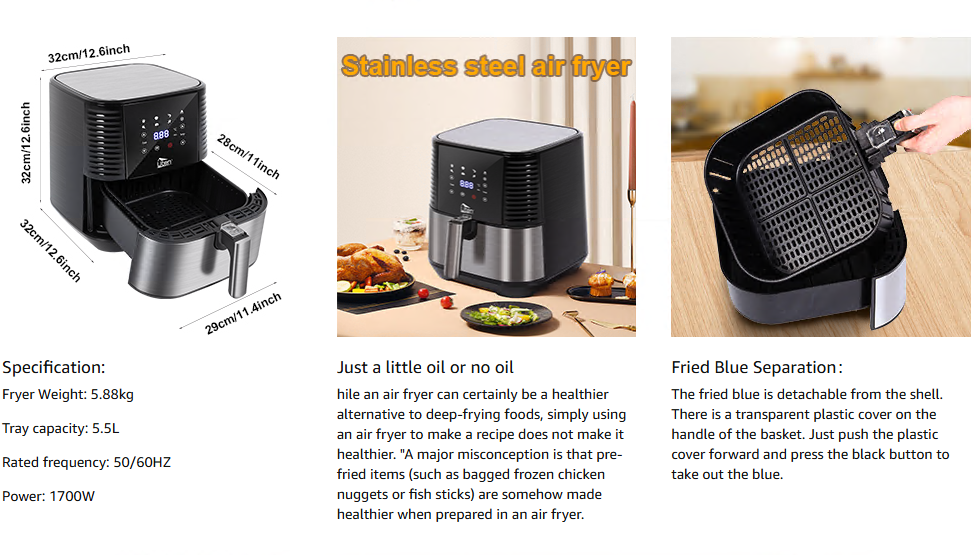 【Extra large capacity】 Our largest 1700 W airfriment with 5.5L cooking capacity, so you can easily prepare enough healthy low-fat food to feed a particularly large family with little to no oil. Success-cooked food is enough to meet the needs of 3-5 people. And it takes less space than frying pans, ovens and microwaves, so your kitchen workplates are no longer overcrowded. 【LED Digital Display- 7 One-Touch Presets】 LED Digital Airfrosis, Temperature and Time are clearly visible. The design is more fashionable and more modern. Steak, chicken, shrimp, fish, pizza, french fries, cakes and vegetables ect. But more than 8, the possibilities and limitless. Just select your preset with 1 simple key press on the display and you can cook. 【Healthy food】 Elegant hot air fryuse uses 360 ° hot air circulation technology for cooking food. It is almost no preheating required, which shortens the cooking time. Compared to the conventional frying method, the use of an air fruit must reduce up to 85% of the fat content in the food, and the food tastes crispy and delicious. This is also an ideal gift to replace fryer and hot air oven. 【Easy to clean and use】 A big, completely removable roasting basket in family size allows easy cleaning! This product is supplied with a scratch button to ensure maximum security while using this product. When using the Uten airfryer , it does not smell. So you can roast healthy, oil-free foods for your whole family, grill, bake and roast. Specification: