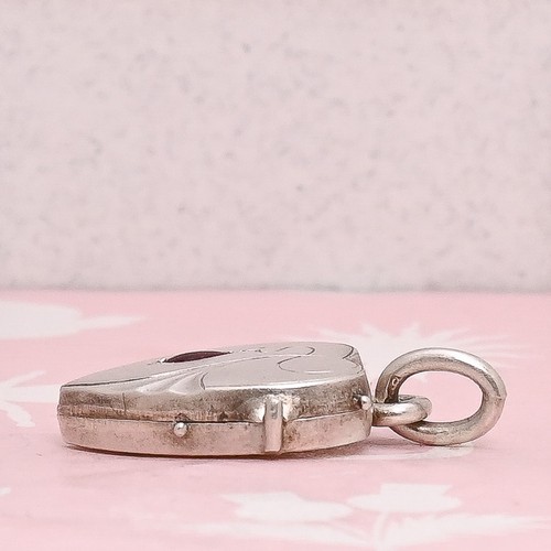Ethereal and free-flowing. With a classic heart shape this antique Jugendstil silver locket is a treasure to behold. The intricate hand-etched whiplash design culminates into a ruby-hued paste, coming together to create a radiant piece that's sure to capture your heart. Its chased pattern at the back adds an extra touch, creating an ethereal shimmer. Wear it on your favorite chain or charm bracelet to keep your cherished memories close.