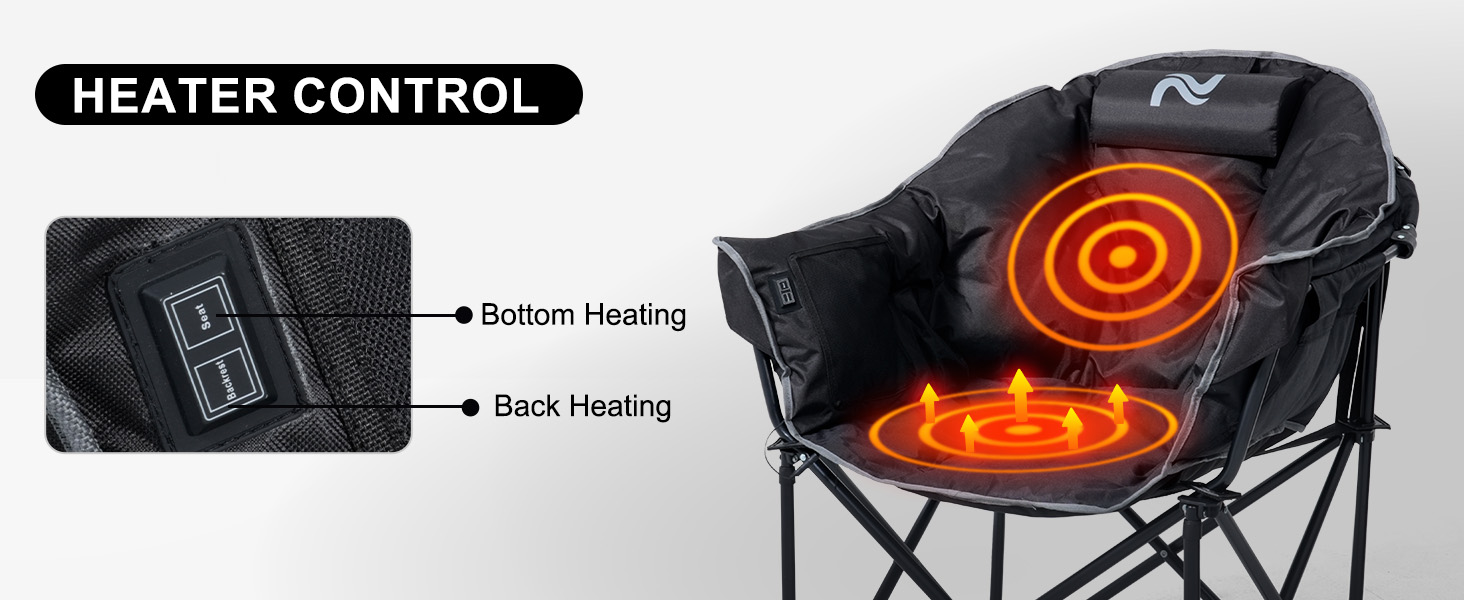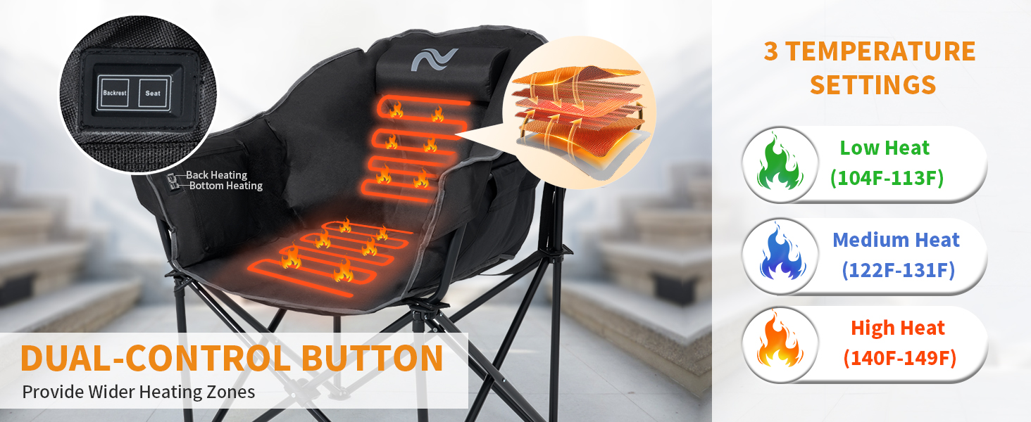 【Dual Heating Zones with 3 Levels】With 3 heat settings (green for low, blue for medium, and red for high), this heated camping chair offers personalized comfort. The dual-control button allows separate temperature adjustment for the back and hip positions, making it effortless to tailor the warmth to your preferences.