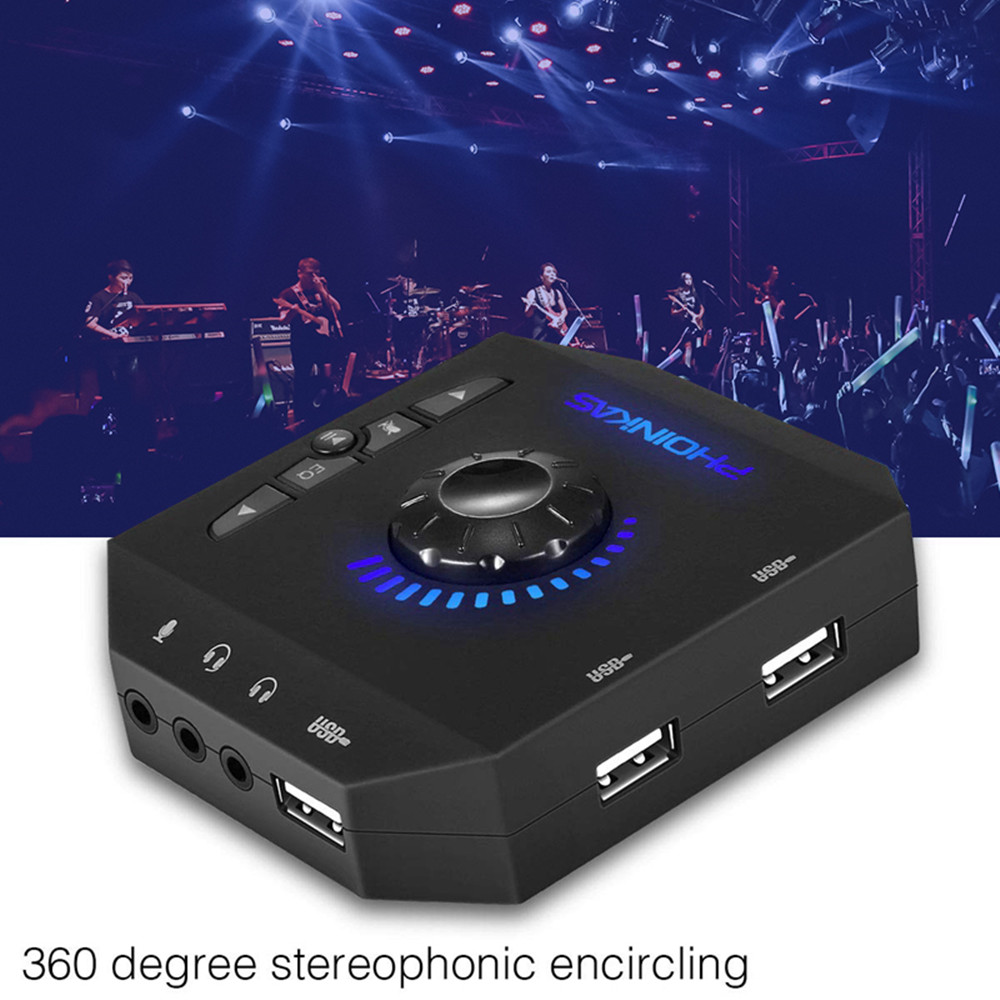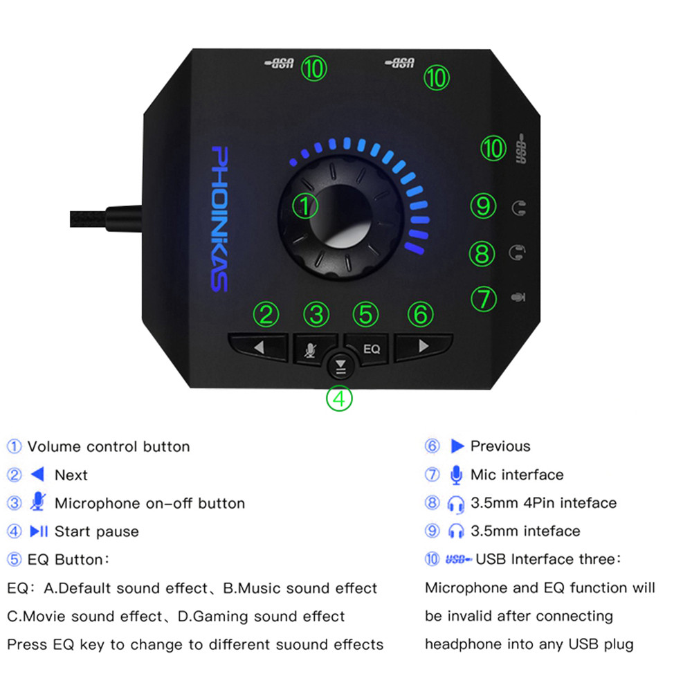 4.Mixing function: The mixer function can adjust the output electronically. The function keys include microphone mute, speaker mute and volume up/down wheel. Mini LEDs and surround sounds increase the level of game audio. Two headphone jacks with one microphone jack for all your external sound card adapters.