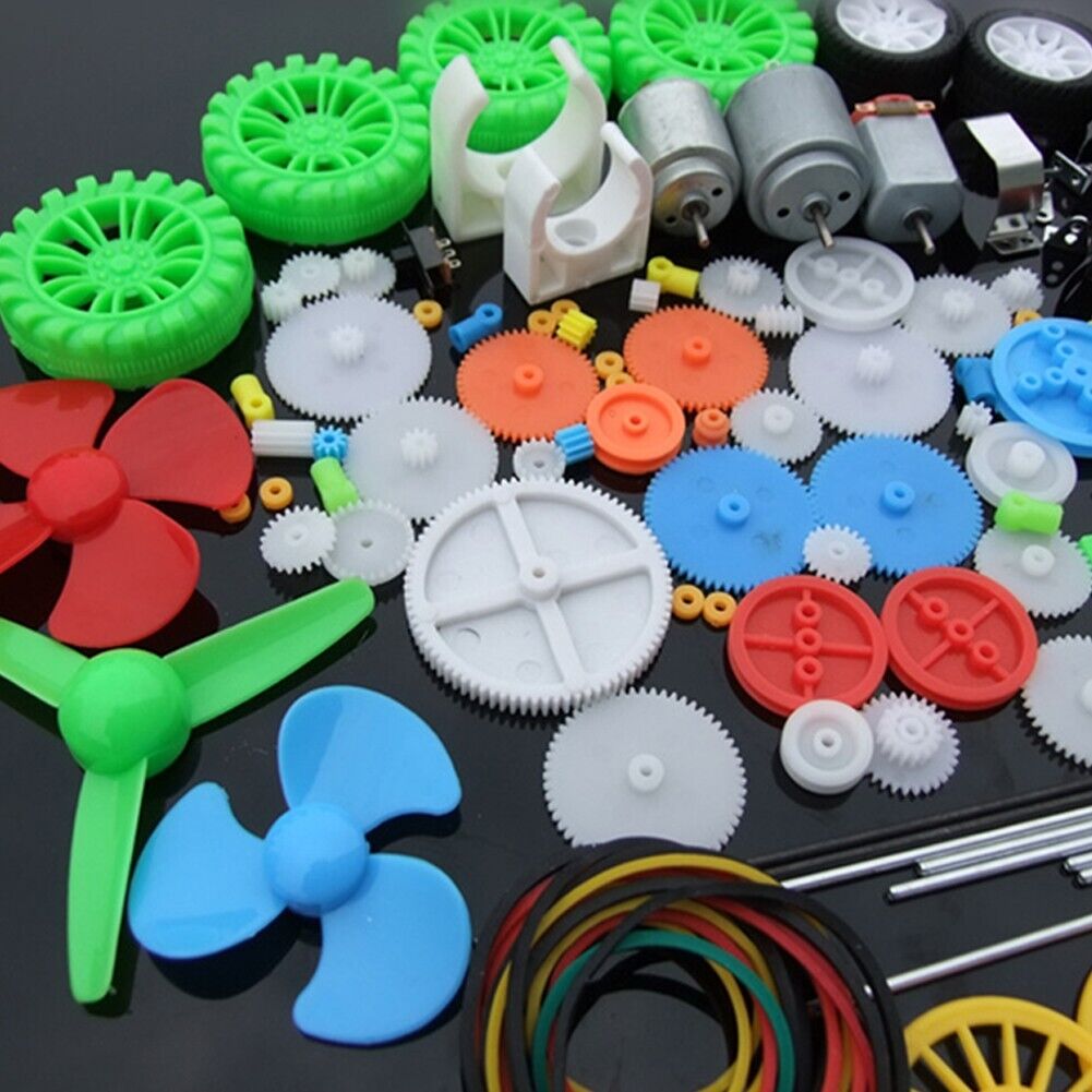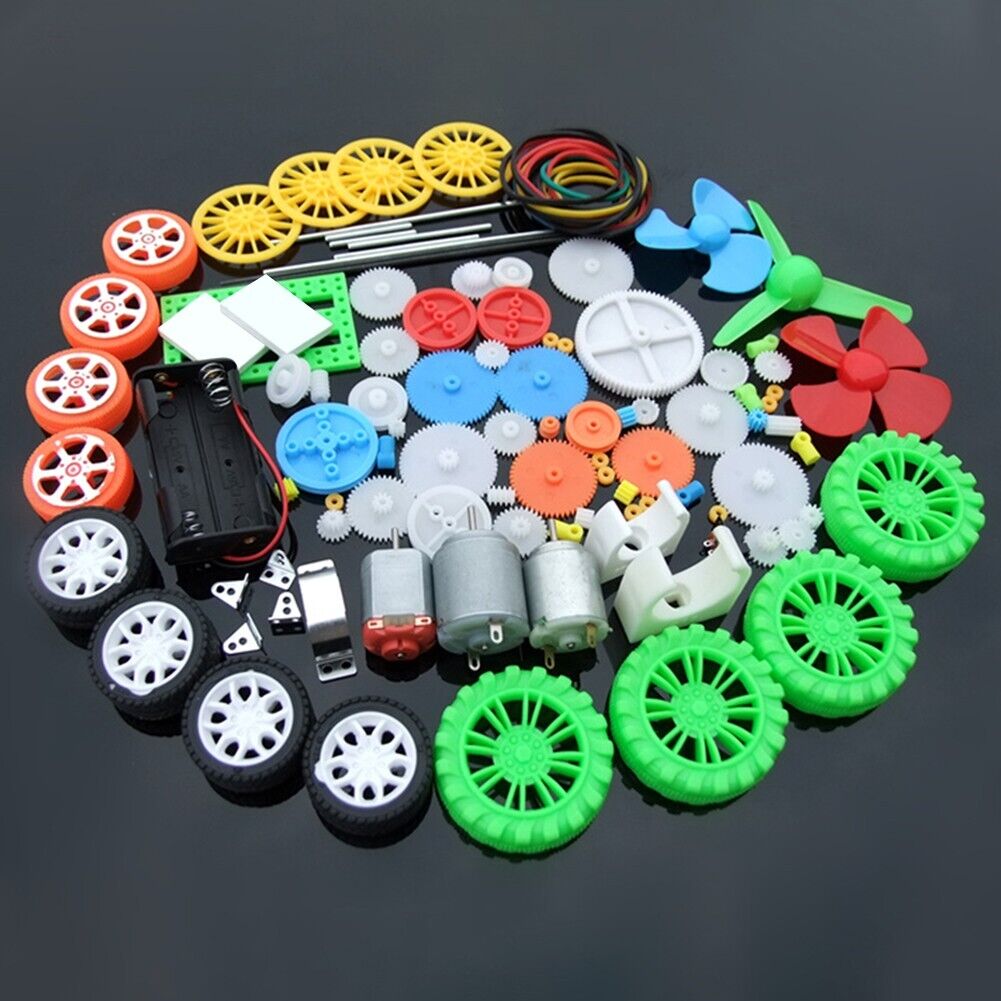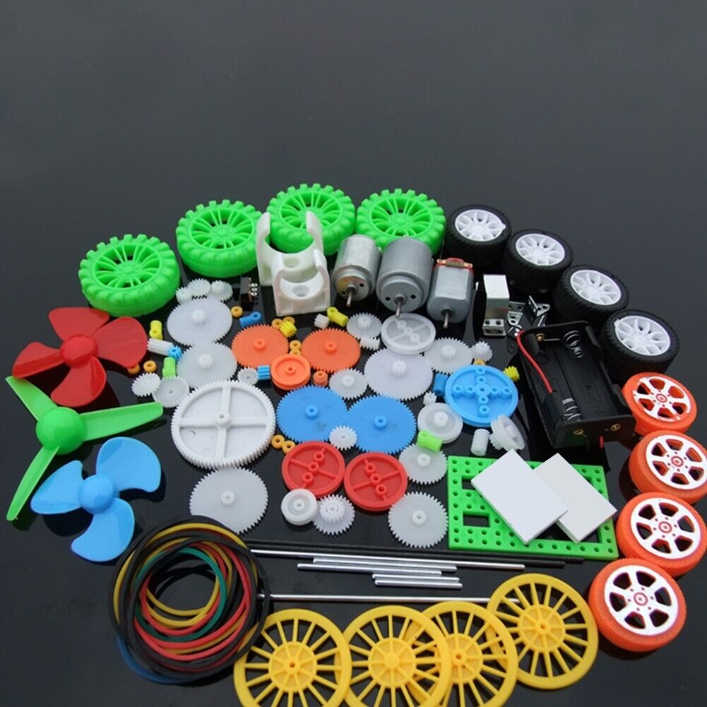 112 various materials! Equipped with 130 motor, 260 motor, 140 motor (the motor is different for each batch, the shaft length and tail cover may be slightly different), which are often required by toys, and others include single-layer gears, double-layer gears, crown teeth, Main shaft gears, worm gears, pulleys, fixed brackets, plastic plates, belts, bushings, wheels, axles, switches, battery boxes, propellers, stickers, angle irons, etc., are relatively complete, and the overall package is relatively cost-effective of!