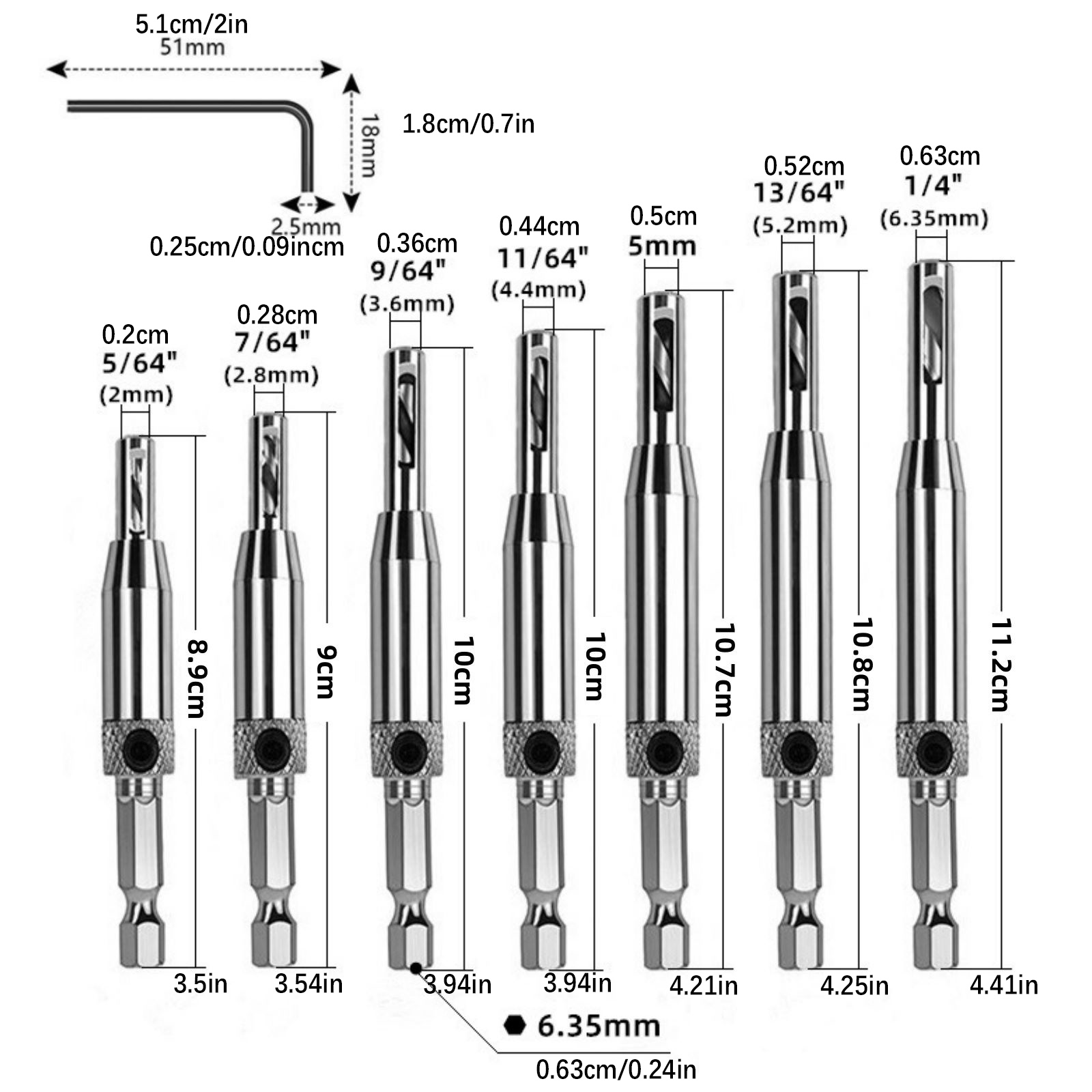 Drill Hole Diameter Suitable Self-tapping Screw Size: 5/64"(2.2-2.8mm), 7/64"(3-3.5mm), 9/64"(4-4.5mm), 11/64"(5-5.5mm), 5mm(5.5-6mm), 13/64"(6-6.5mm), 1/4"(7-7.5mm)