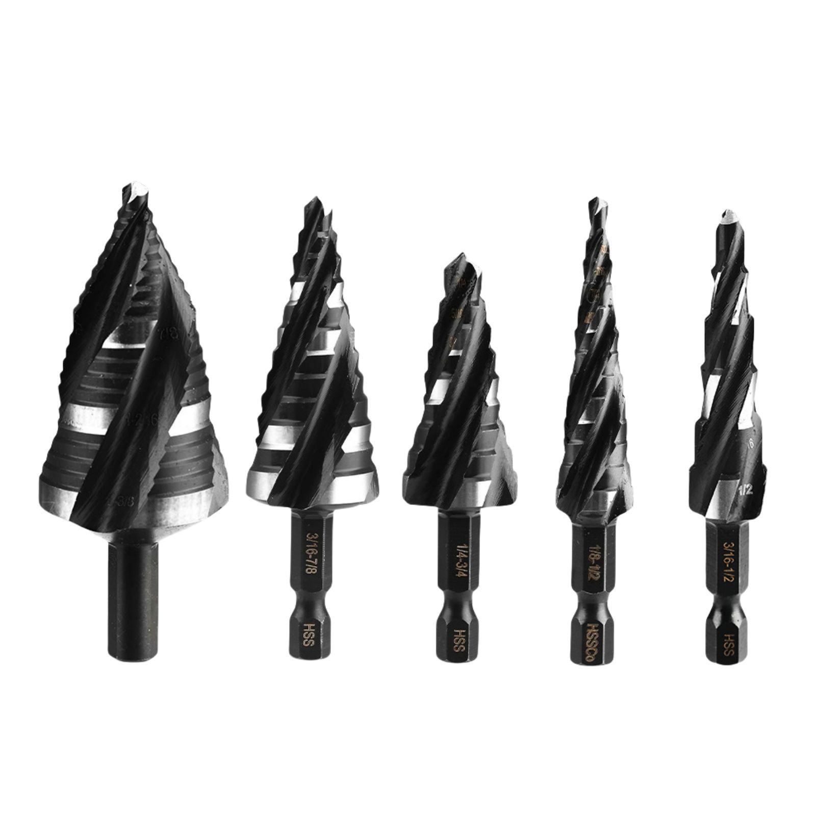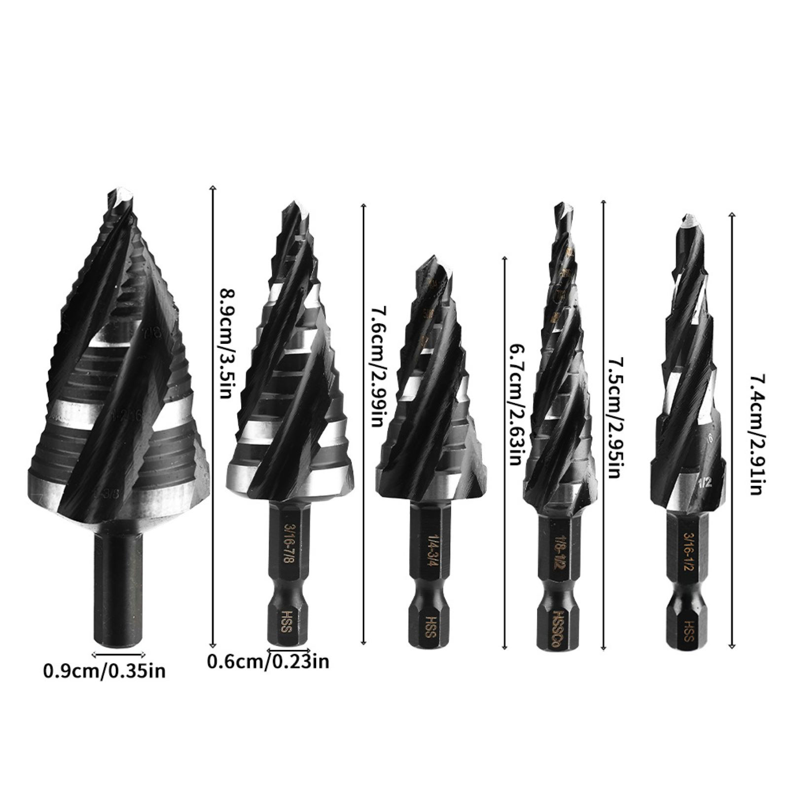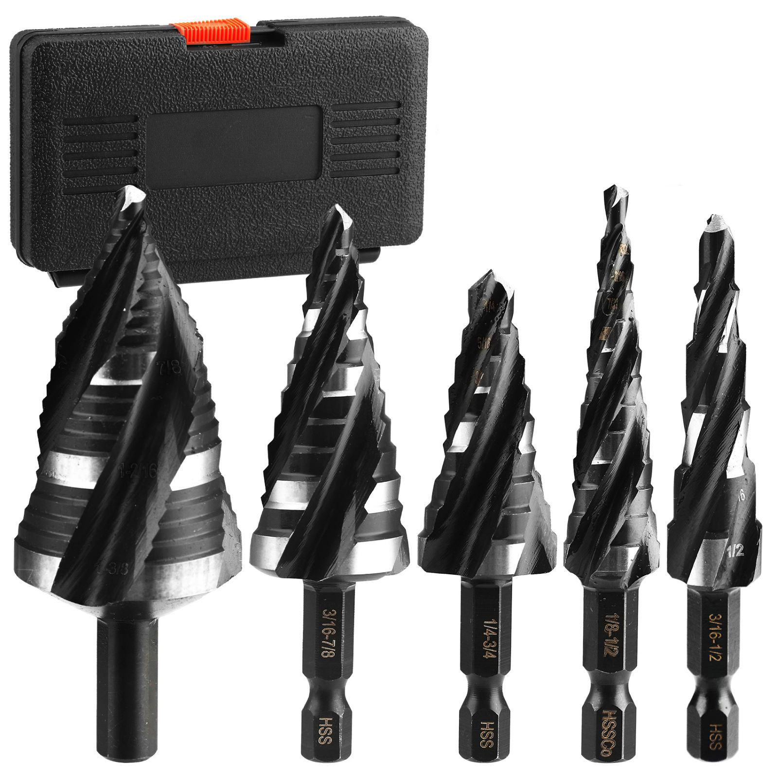 Efficient Multi-Size, All-in-One Solution: Equipped with 5 step drill bits covering a wide range of sizes (1/4"-3/4", 1/8"-1/2", 3/16"-7/8", 3/16"-1/2", 3/16"-1-3/8"), eliminating the need for frequent bit changes and effortlessly handling diverse drilling requirements. A bonus chamfering tool is included for instant burr removal after drilling, saving time and effort.
