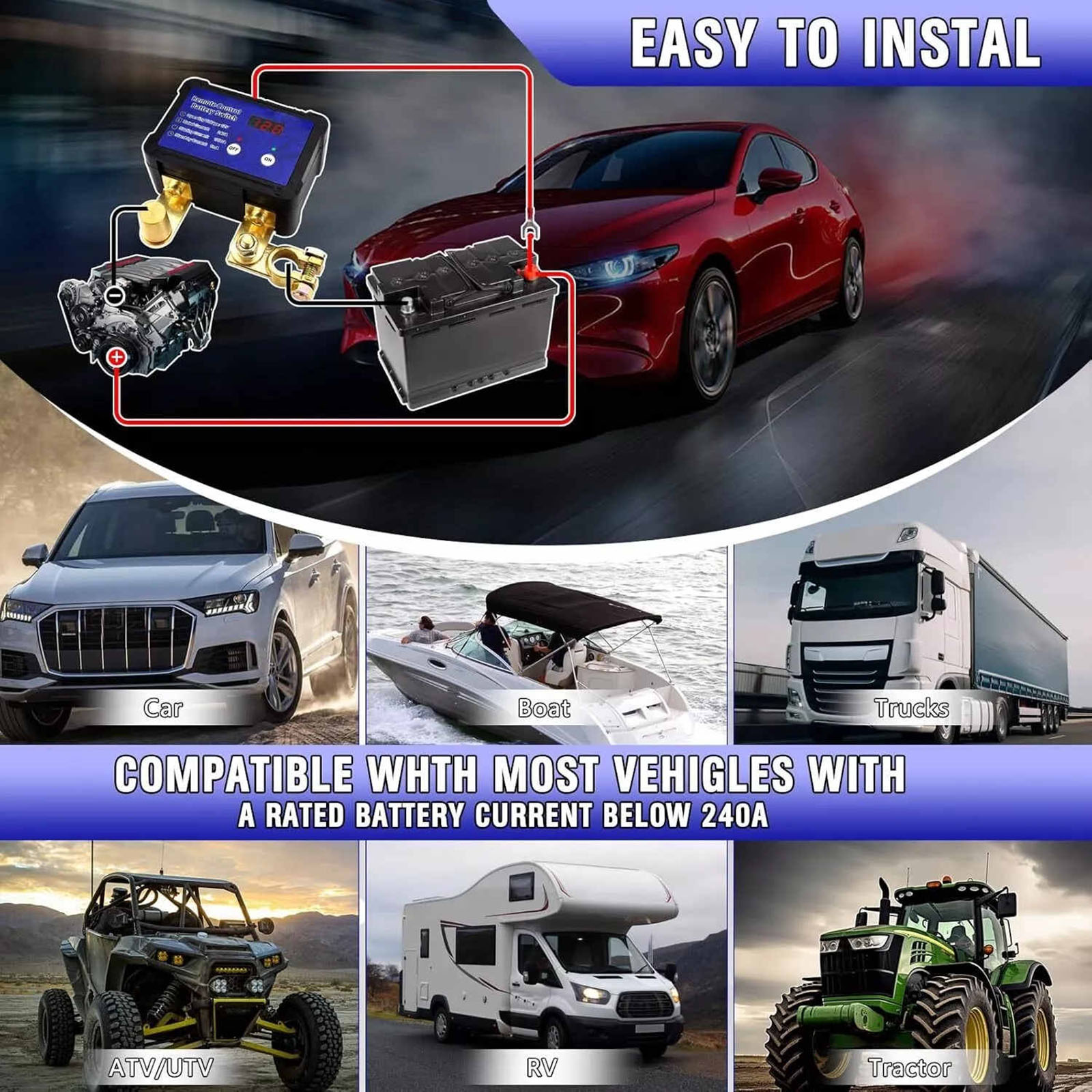 Car battery shut off switch is suitable for most 12V vehicles such as cars, boats, RVs, trailers, trucks, ATVs, UTVs, and motorcycles with displacement less than 4.0. 240a battery switch with a negative pole of 15-17mm, not for those with small stakes of 9-13mm