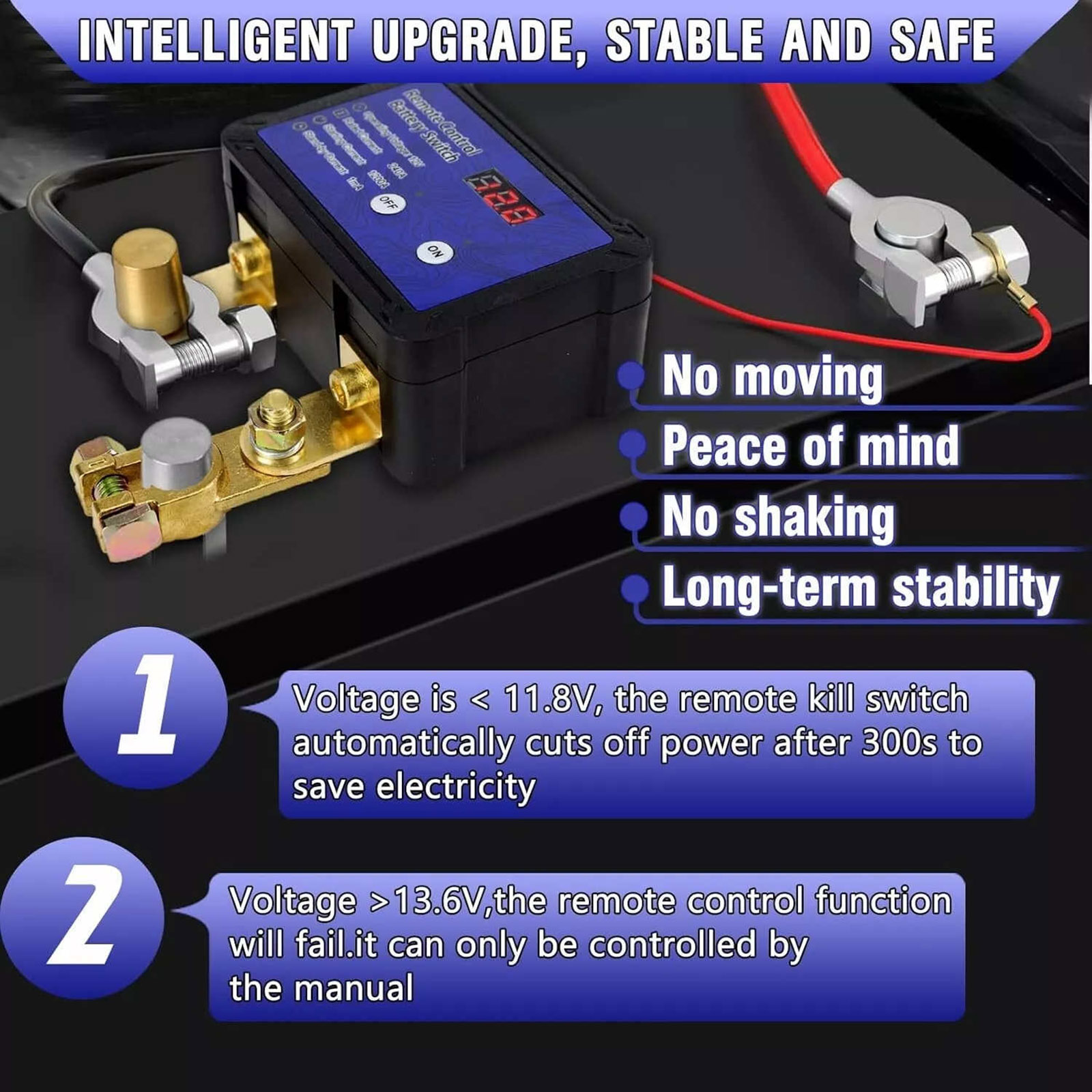 When battery voltage <11.8V, auto-disconnect after 5 minutes to prevent over-discharge. When battery voltage > 13.6V, remote unresponsive.On/off only by manual buttons to avoid wrong operation while driving