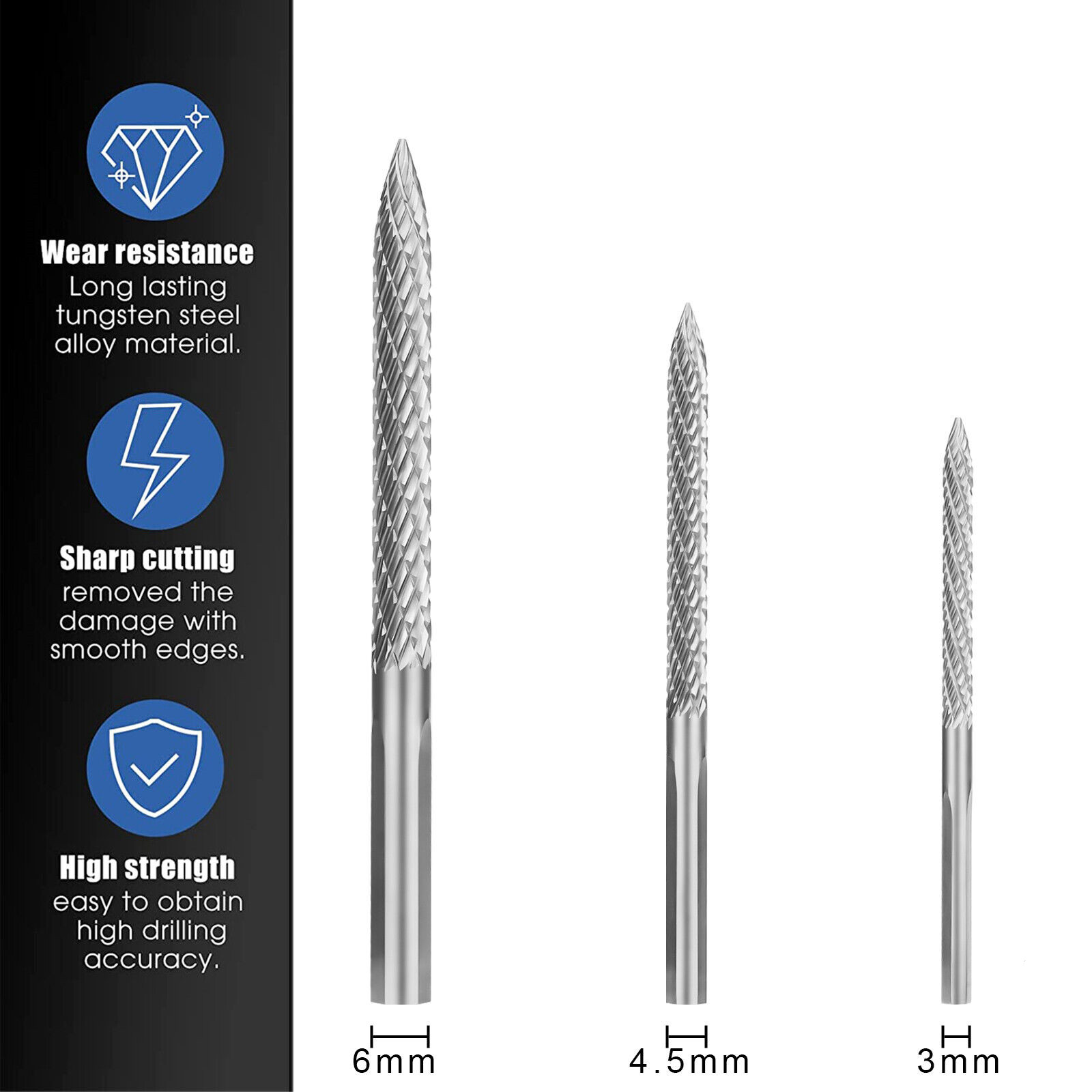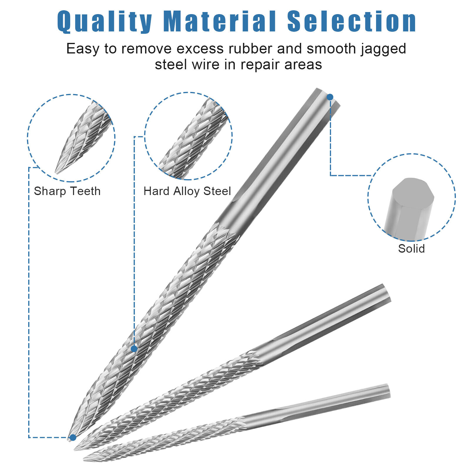 STURDY: Our tire repair carbide bits are made of hard alloy steel. Solid, wear-resistant, and pointed. Strong enough against breakage, rust, and abrasion, serving you for faster cutting and longer using life.