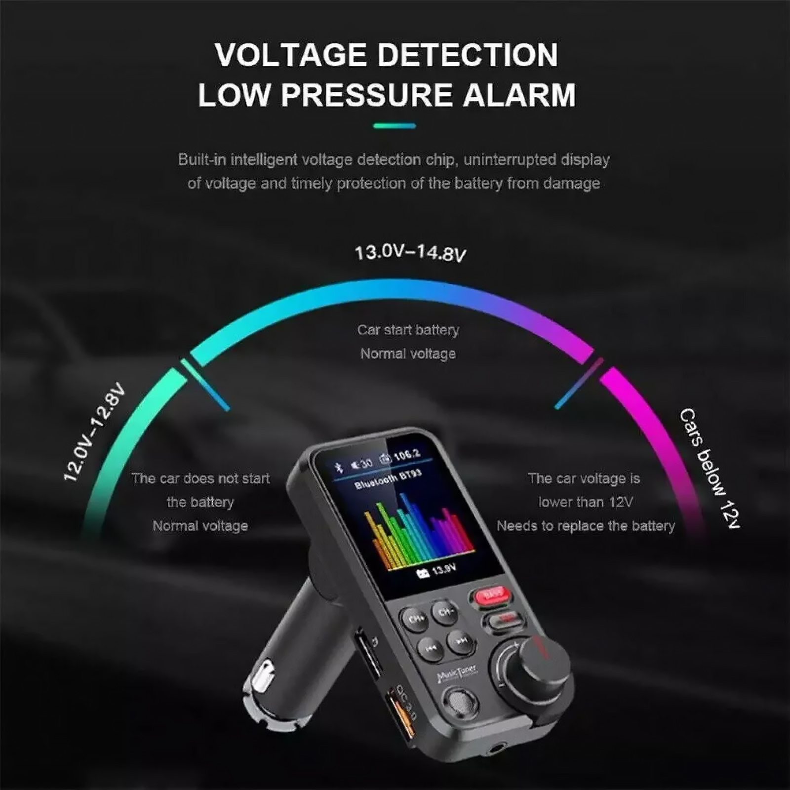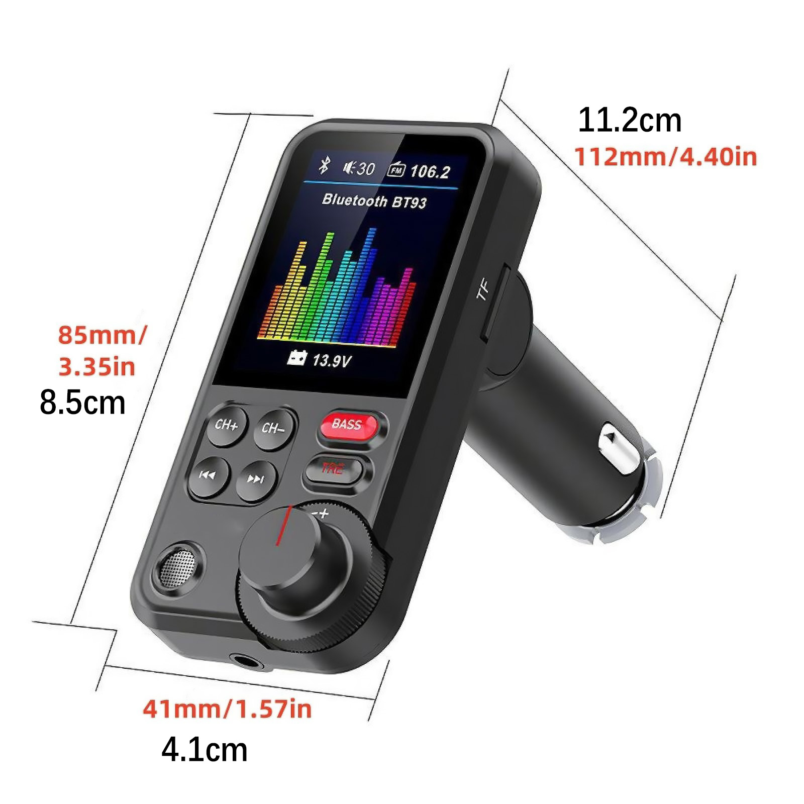 1.8 Inch TFT Color Screen: Displays lyrics, playback status, incoming phone numbers, track names, FM frequency, battery voltage, and Bluetooth connected device info, offering a wider visual interface.