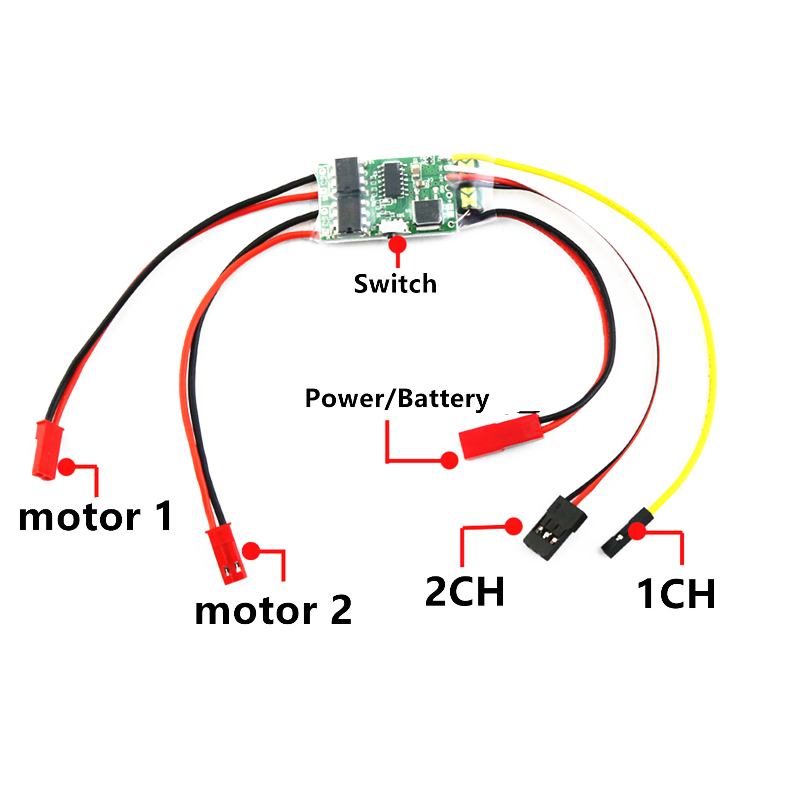 Dual-channel synchronization: In mixed control mode, if the single yellow line is not connected, or the single yellow line is connected to the receiver "-", the two motors will be controlled synchronously by the throttle.