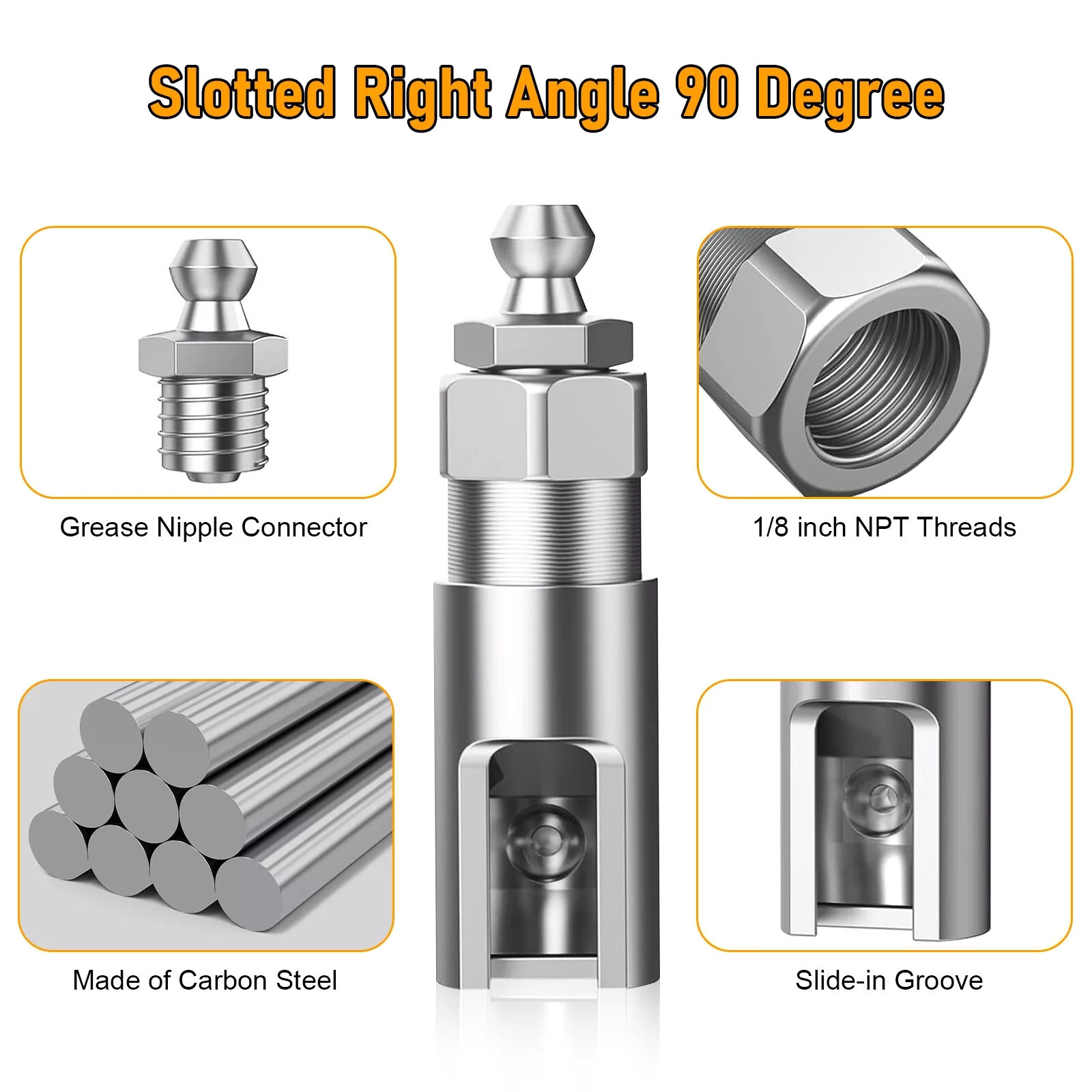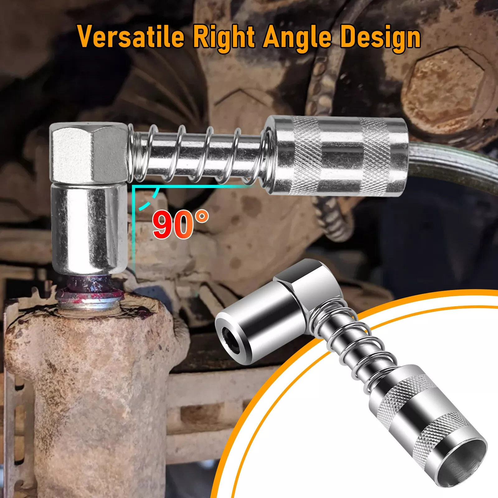The 90-degree grease coupler features a space-saving design that easily navigates obstructions and confined spaces. Its right-angle configuration ensures smooth application without losing precision, while the slotted variant adds versatility for greasing even trickier fittings.
