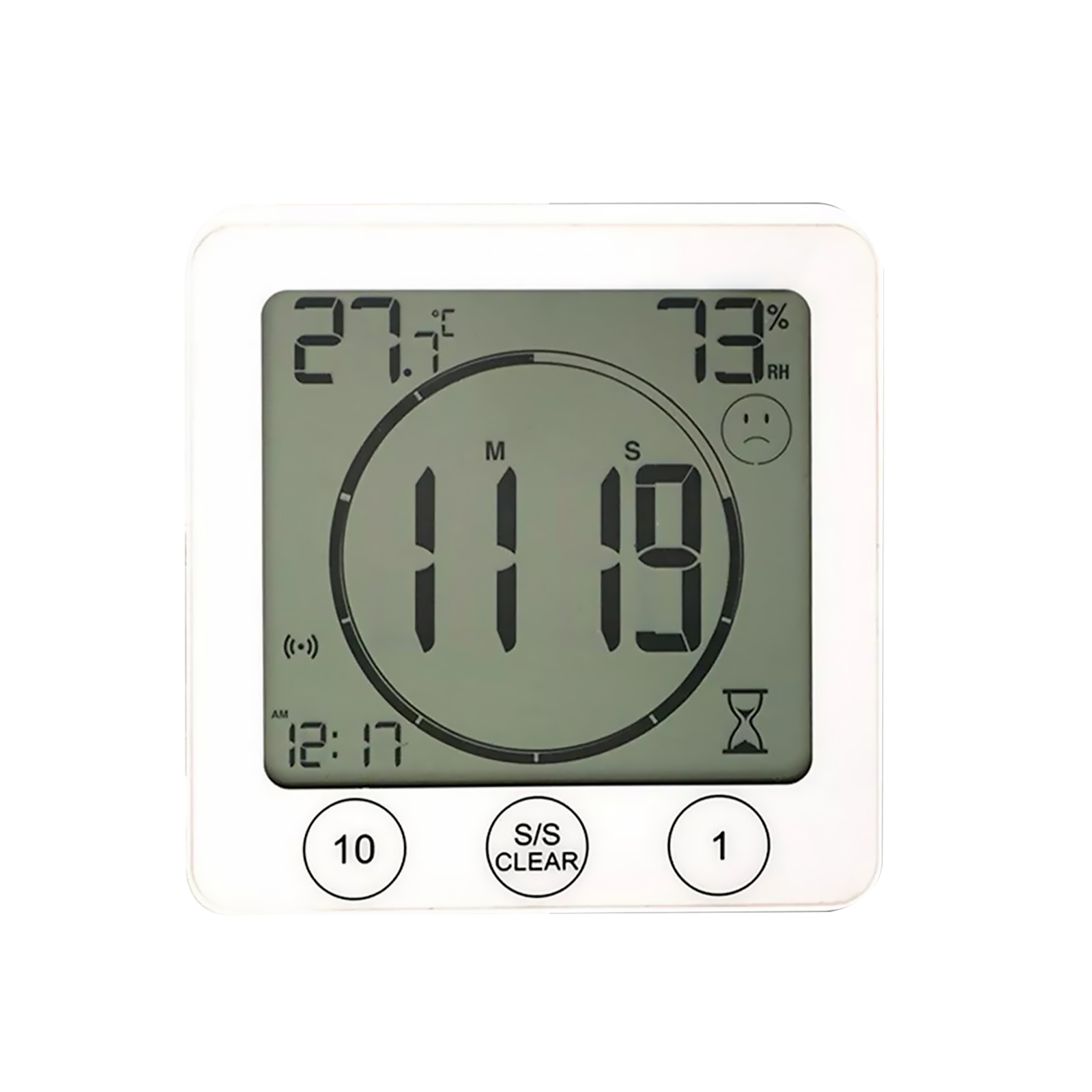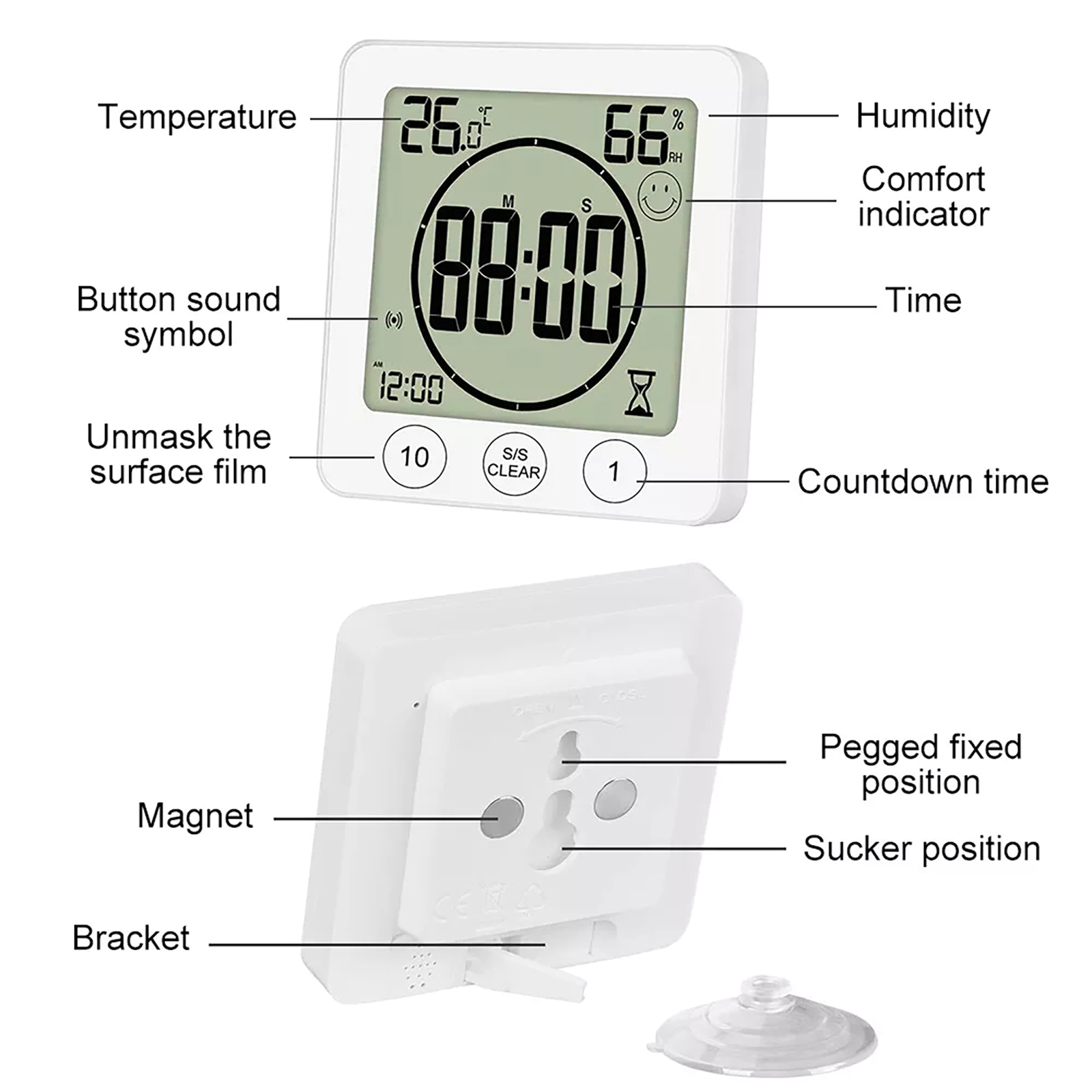Display / Function: time, °C/°F temperature, humidity, 12/24 hour format, alarm and countdown timer