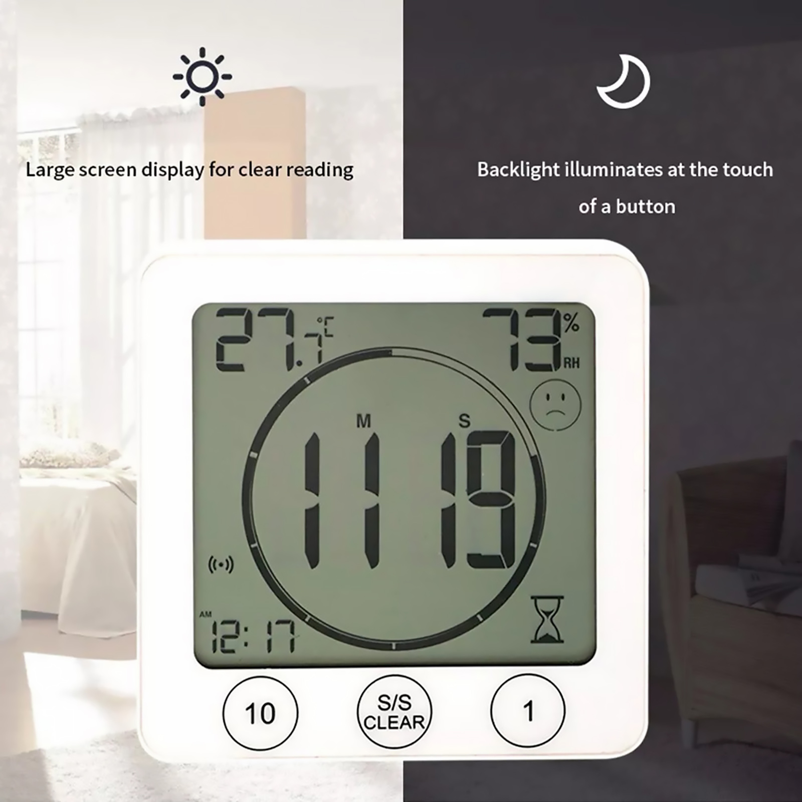 A timer with time display(12/24 hours), temperature humidity indication, comfort indication on LCD screen. It's not only a touch screen timer, also a clock with temperature for your baby. A loud alarm can be heard in a nearby room.