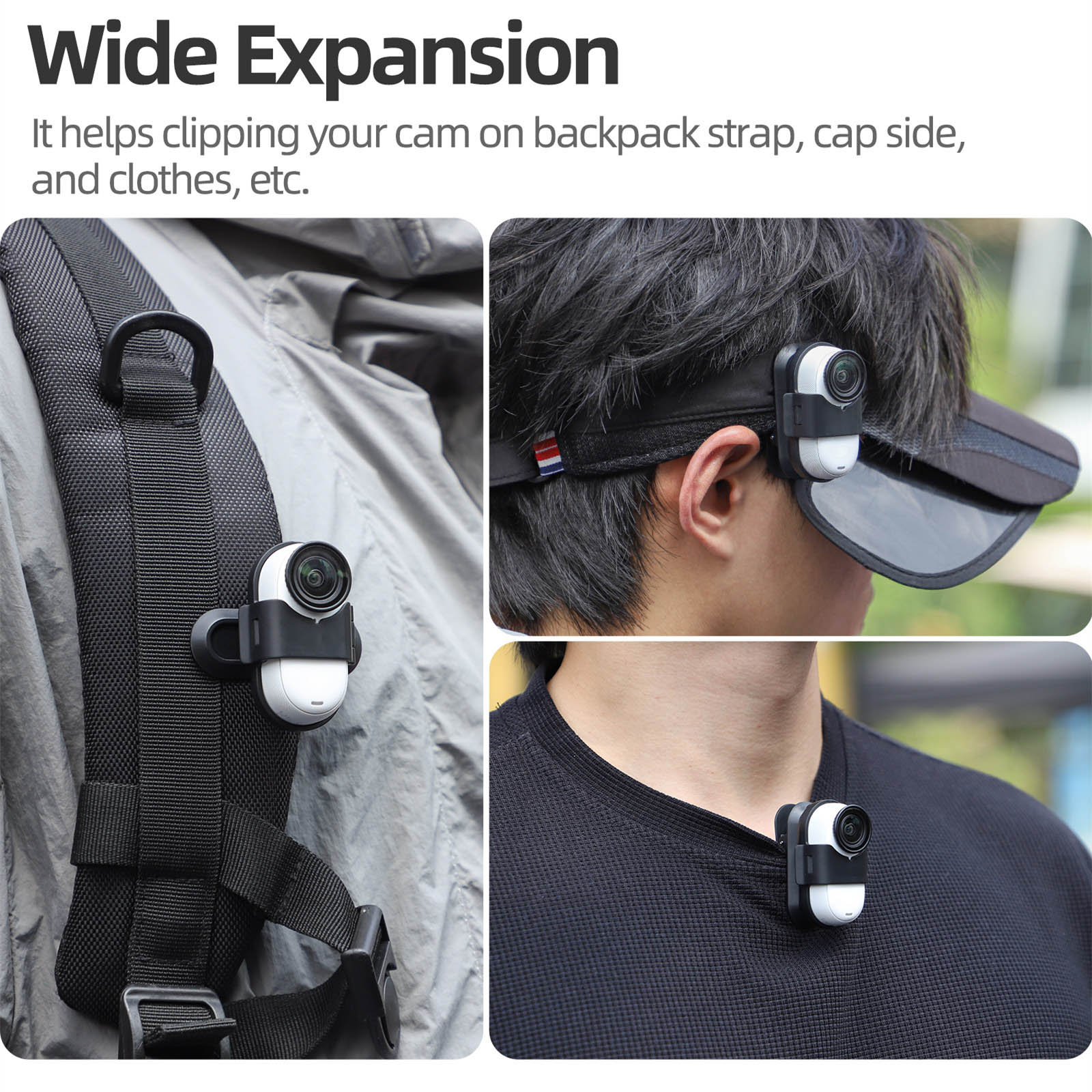 Wide Expansion, It helps clipping your cam on backpack strap, cap side, and clothes, etc.