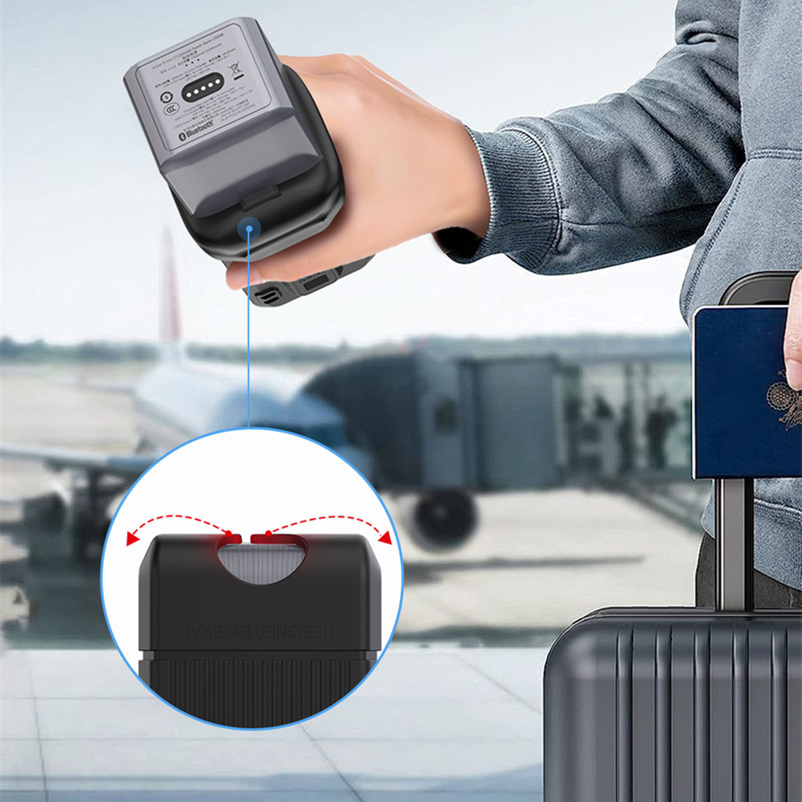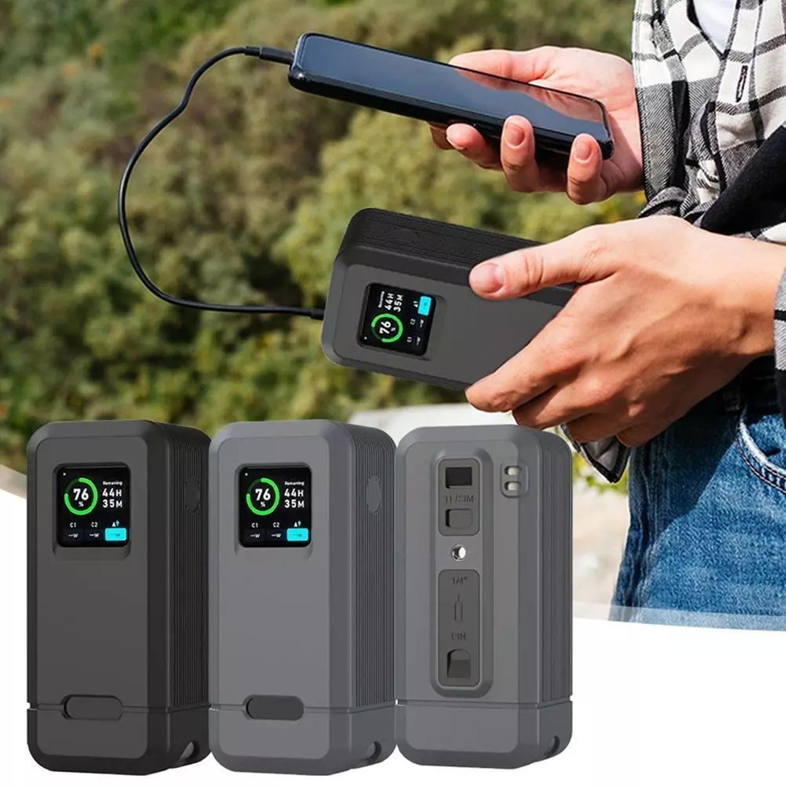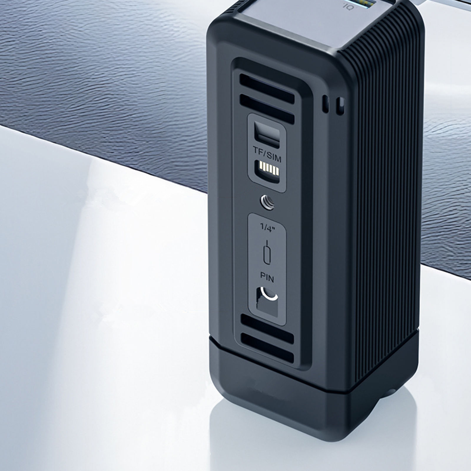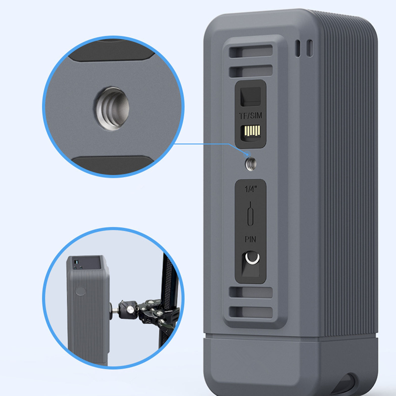 Silicone cover equipped with 1/4-inch screw hole, TF/SM card slot, and SIM pin storage slot. In addition to protecting the power bank and facilitating daily use, it can also be used for camera charging and mounted on a camera tripod. The camera's memory card and other accessories can be conveniently stored.
