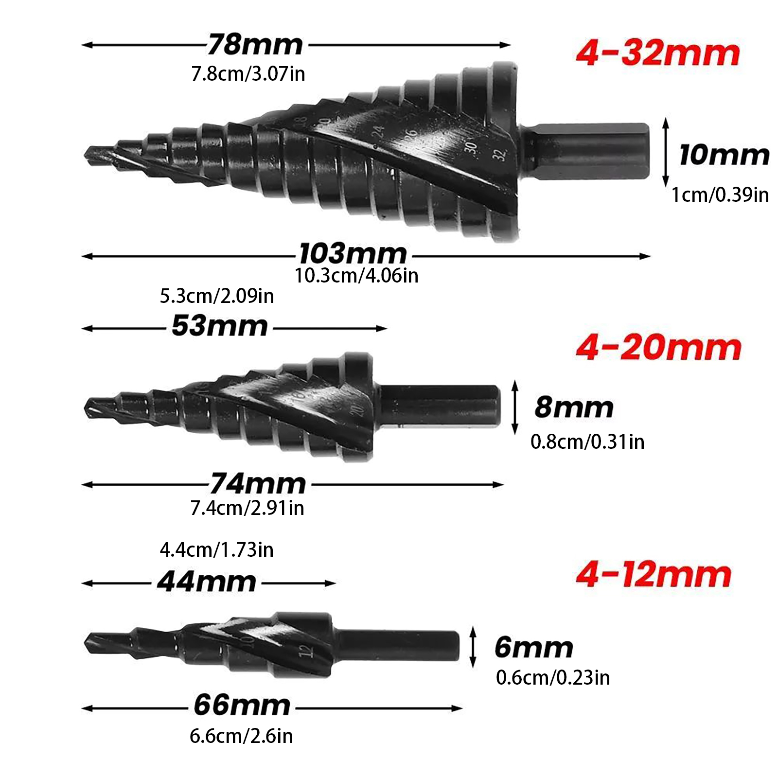 4-32 Drill Bit: 15 Steps(Diameter 4, 6, 8, 10, 12, 14, 16, 18, 20, 22, 24, 26, 28, 30, 32mm) (10mm Shank)