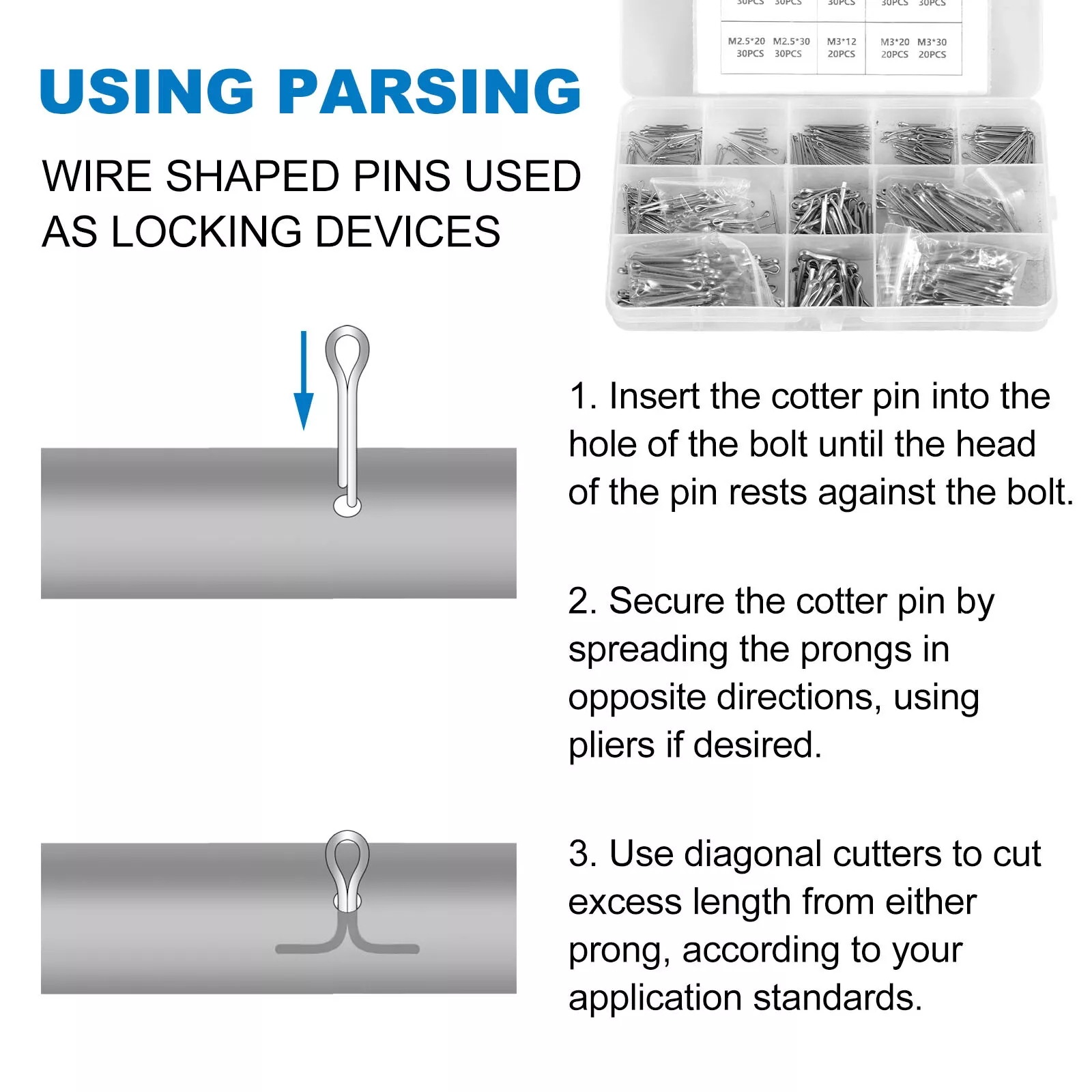 The cotter pin assortment kit can be used as locking devices to secure pins or castellated nuts in automobiles, axles, trailer hitches and tractors. This kit has wide applications.