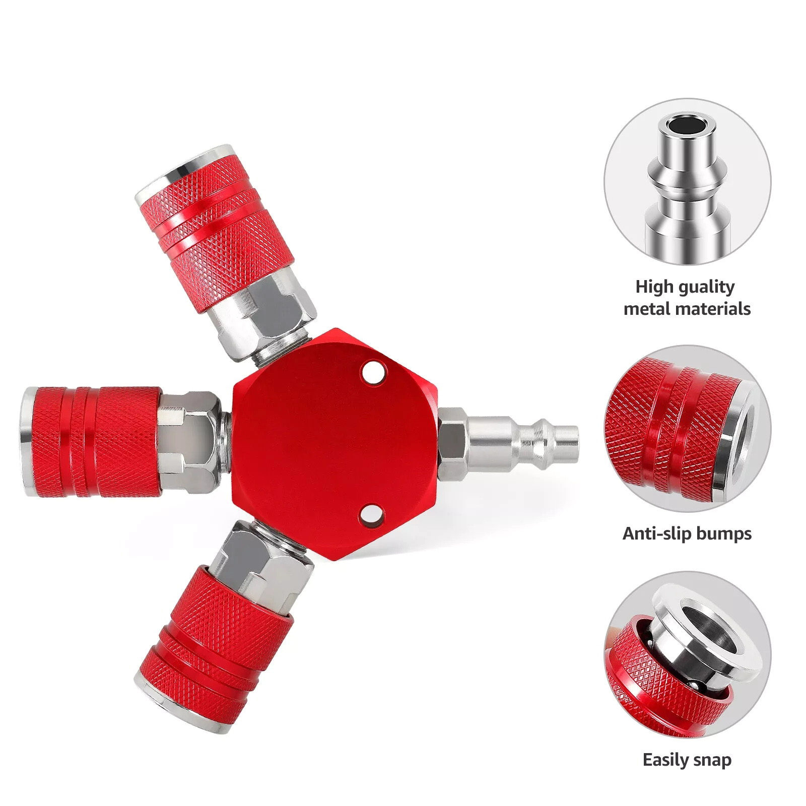 This air hose splitter is made of steel body and coated aluminum sleeve. Input plug is made of steel body and coated aluminum manifold. It has durable structure, long service life and smoother usage.