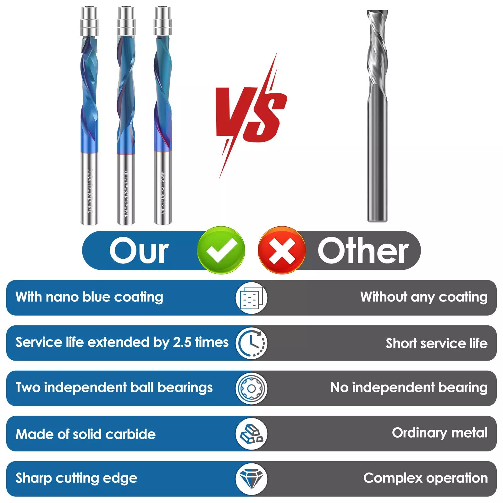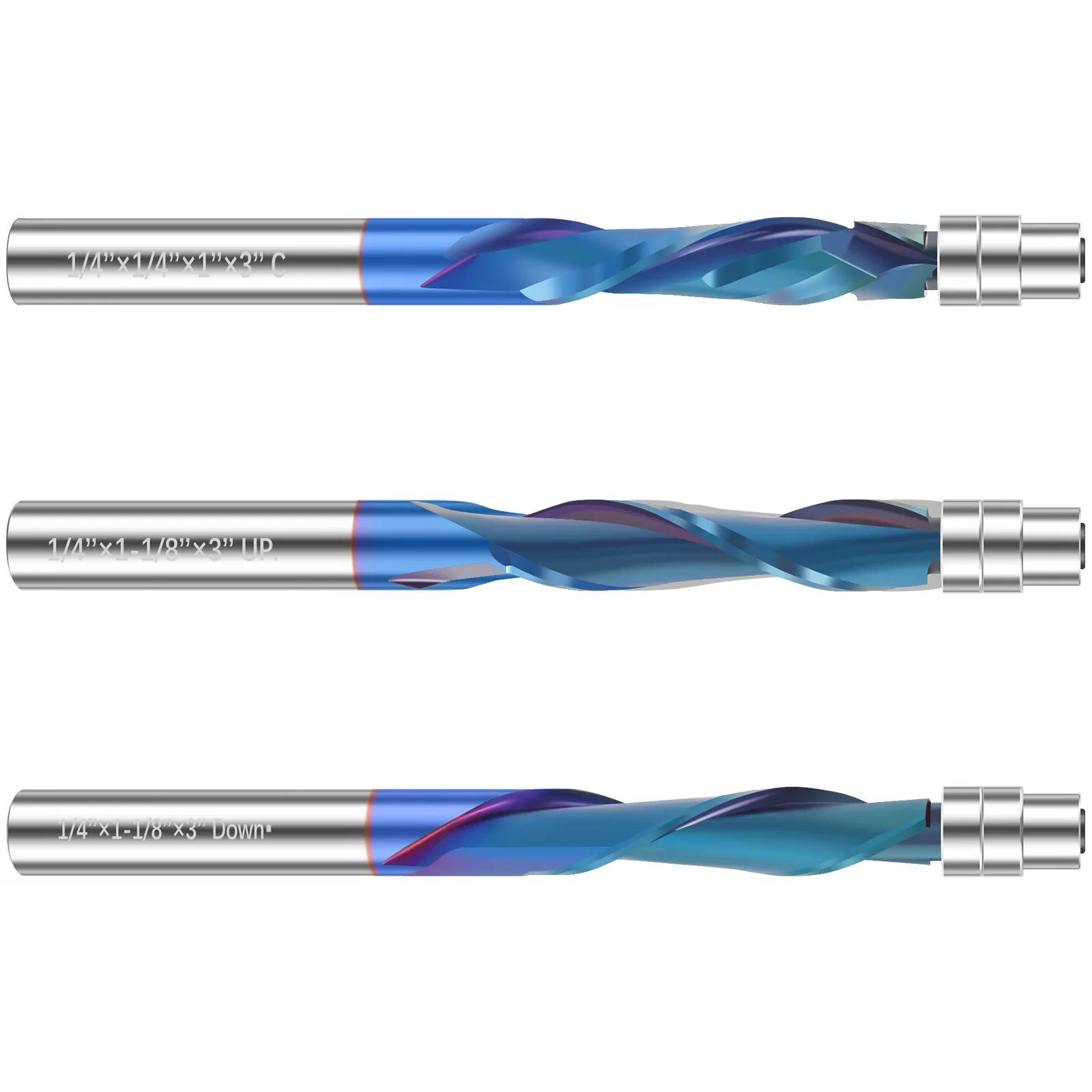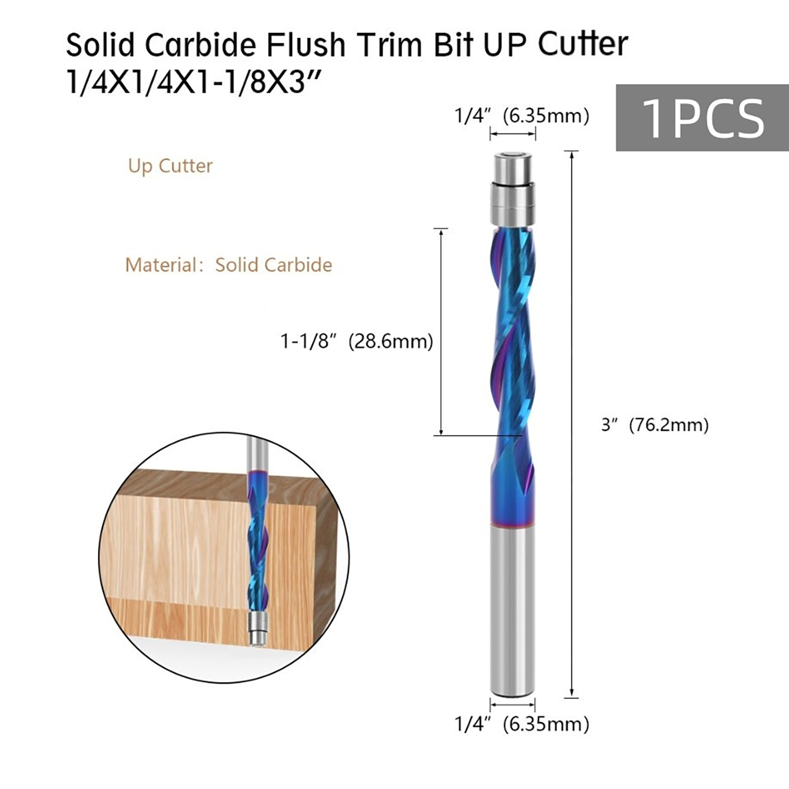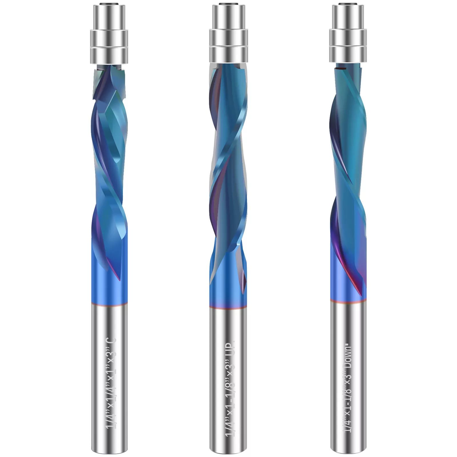 The industrial-grade up-cut flush trim router bit boasts high quality solid carbide construction with a Nano blue coating. This Nano blue coating enhances hardness and heat resistance, preserving the tool's critical sharpness and lubricity, thereby extending its service life and delivering superior cutting results.