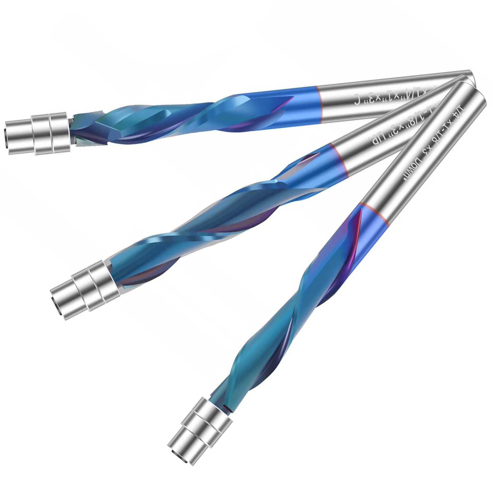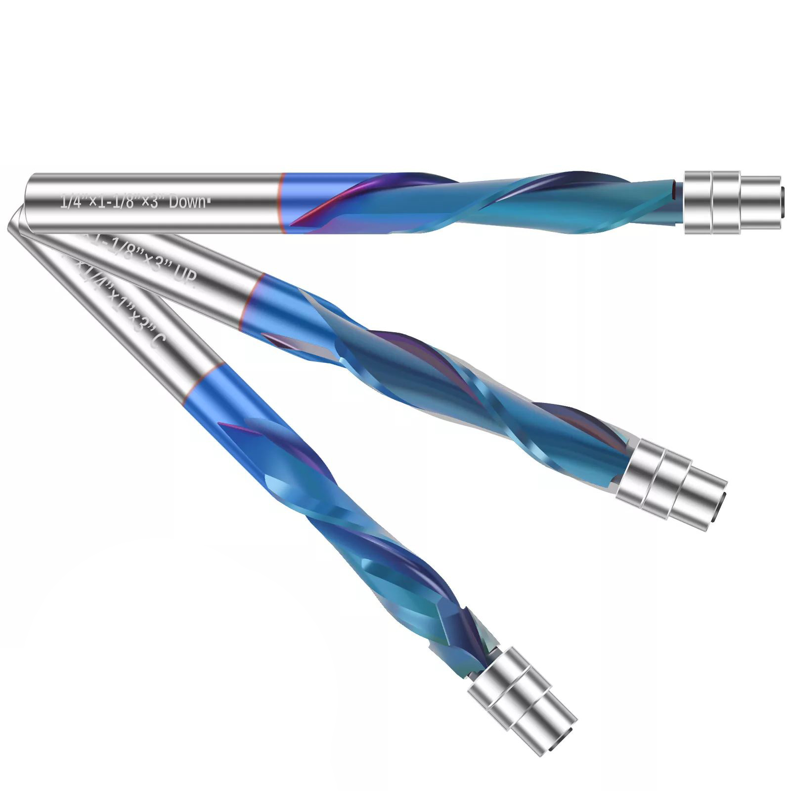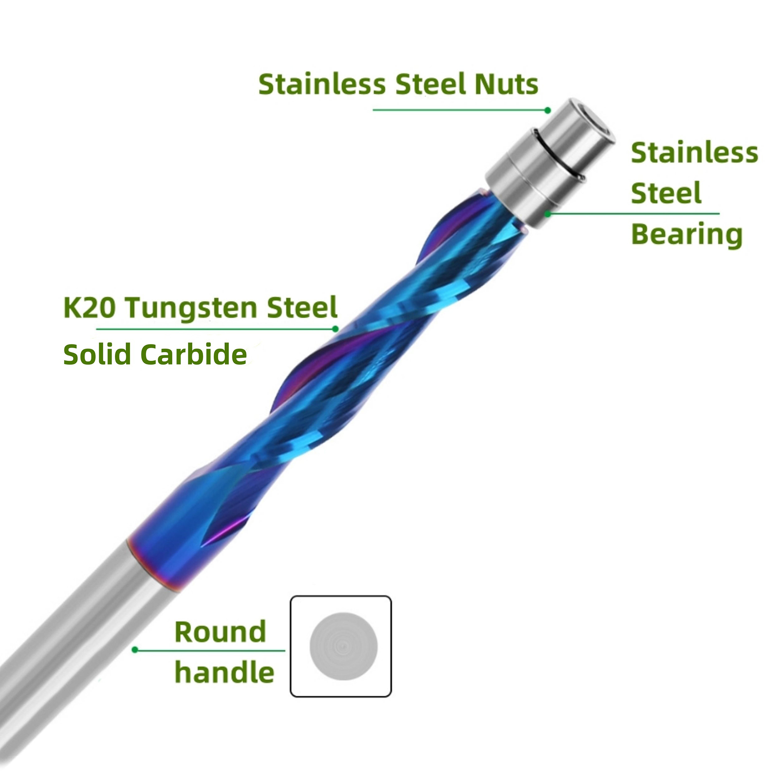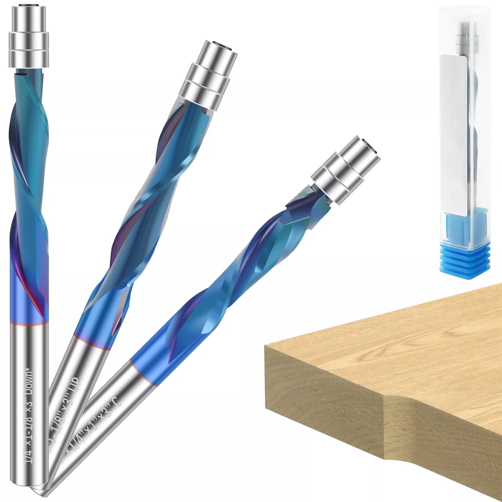 The industrial-grade up-cut flush trim router bit boasts high quality solid carbide construction with a Nano blue coating. This Nano blue coating enhances hardness and heat resistance, preserving the tool's critical sharpness and lubricity, thereby extending its service life and delivering superior cutting results.